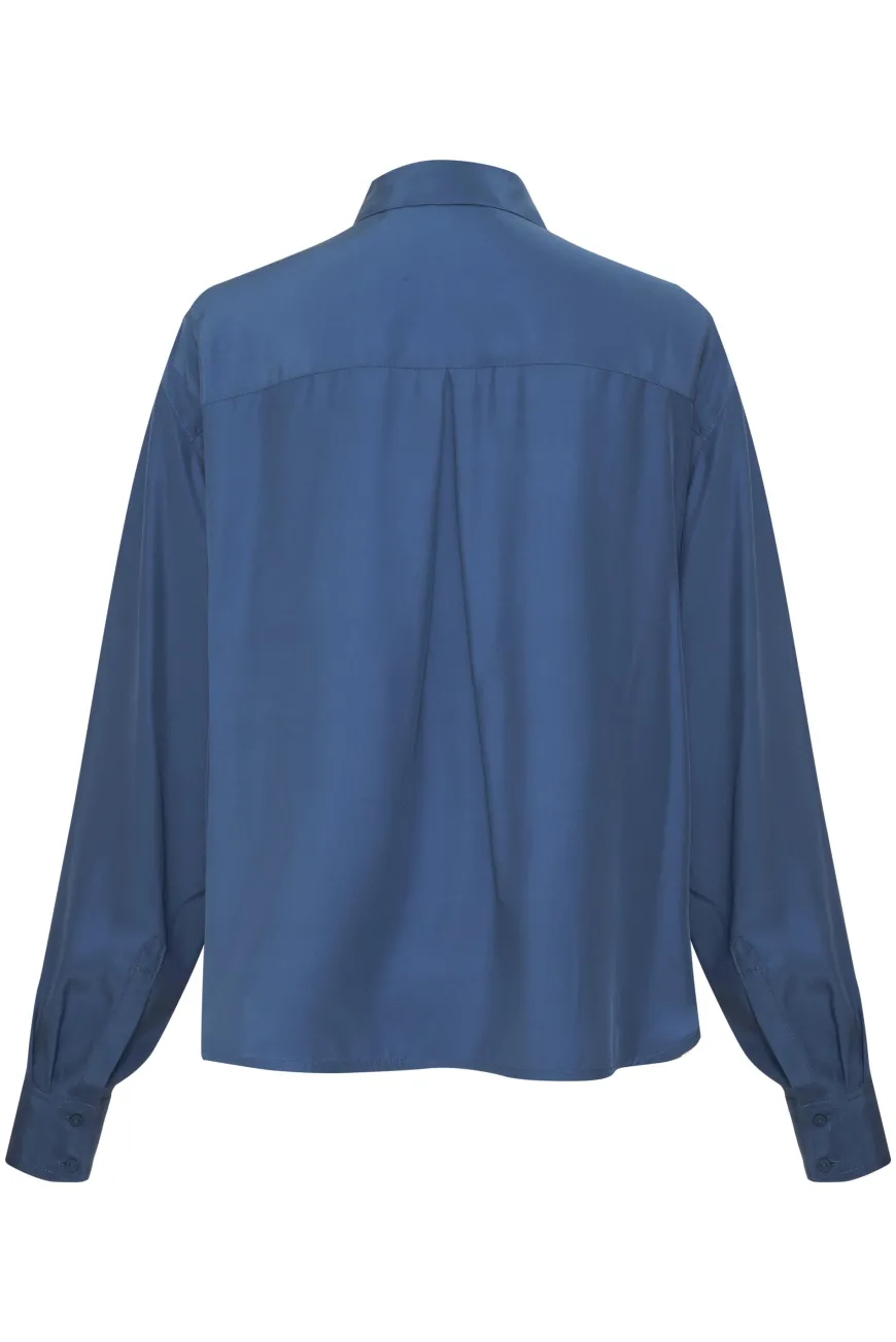 A slightly cropped, silk top with collar, center front buttons, two chest flap pockets, long sleeves with button cuffs and a center back pleat.