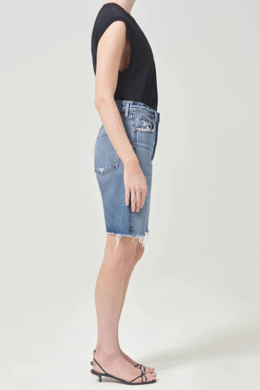 Inspired by our best-selling 90’s fit, the 90’s short is relaxed on the wiast with a raw hem above the knee.