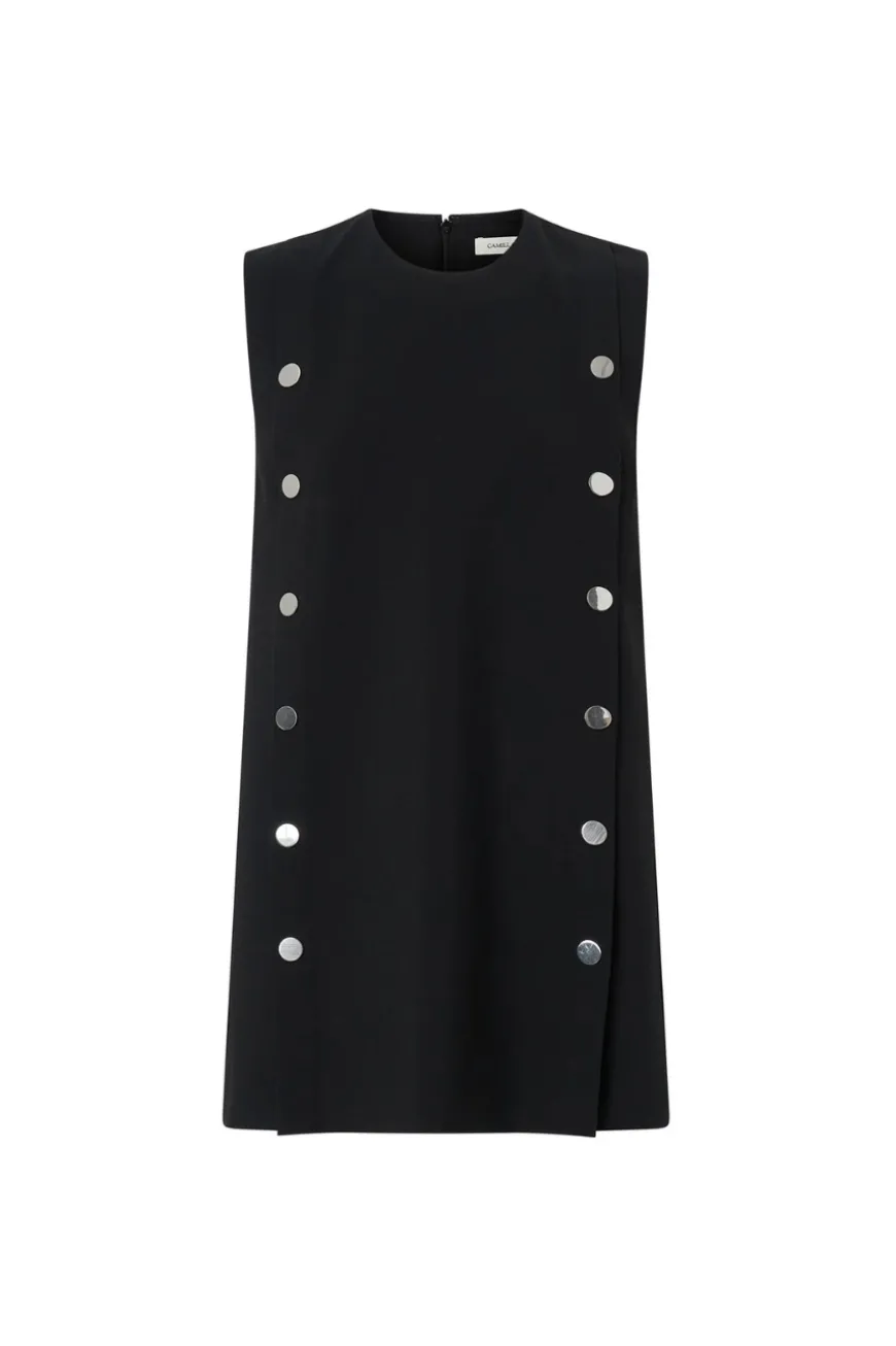 The Amyris Mini Dress features a sleek high neckline and a boxy fit, offering a modern, relaxed silhouette. The slight A-line shape is enhanced with side pleats and metallic snap buttons, adding a touch of contemporary flair. Its distinctive metal button detail creates a bold, structured look perfect for any occasion.