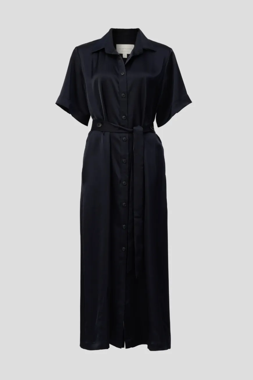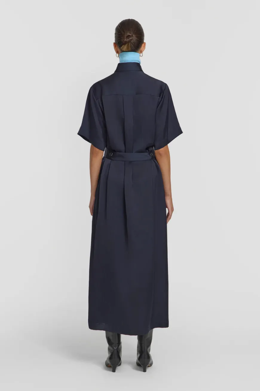 Embody effortless sophistication in the Audition Shirt Dress, crafted from luxurious deep navy cupro. Intricately detailed, it showcases a relaxed fit, two-piece collar, back pleating, and branded buttons for a polished, elevated finish. Complete with side seam pockets and a detachable waist belt, this versatile design effortlessly combines timeless appeal with modern refinement.
