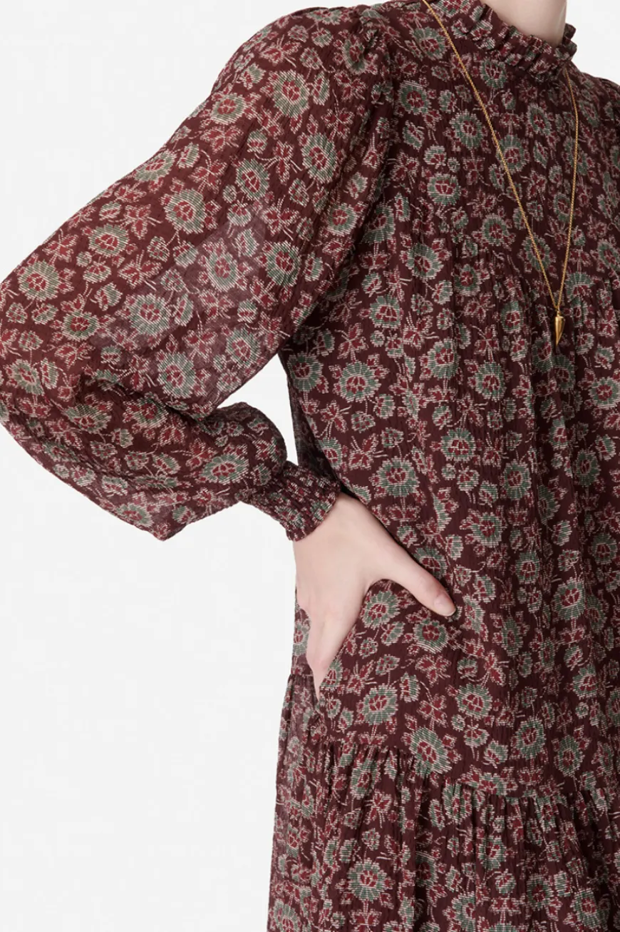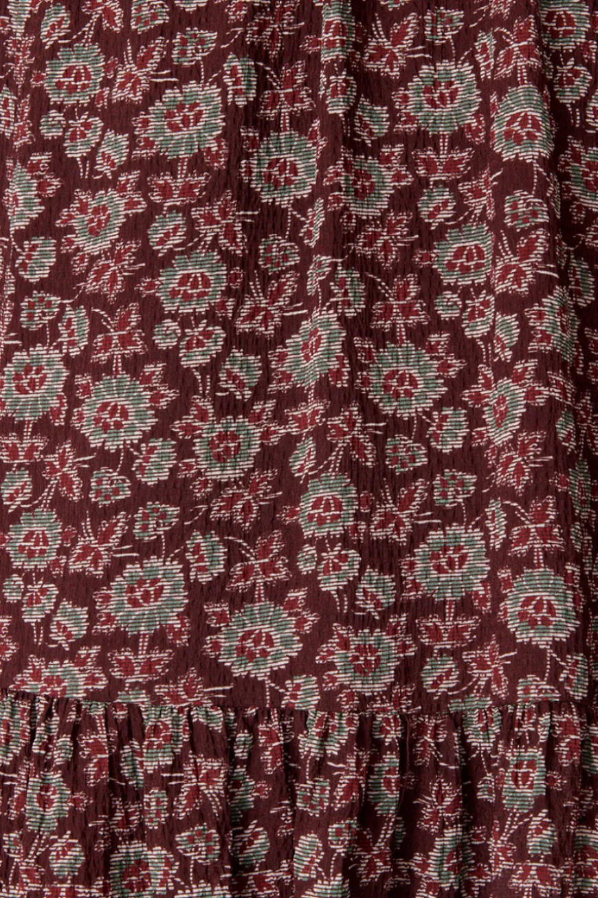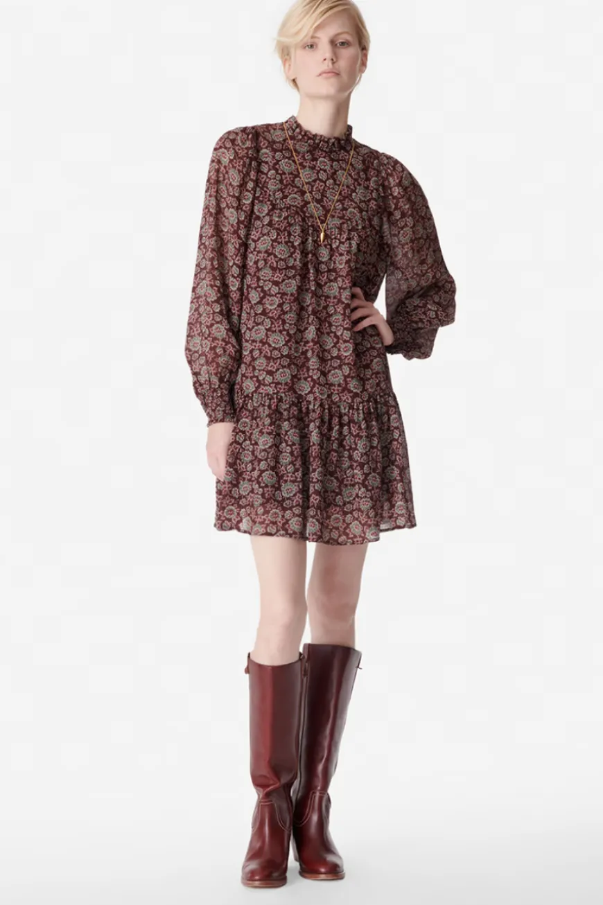 Bohemian and romantic, made in a silk blend, this elegant piece stands out for its fluidity and high collar. Embellished with a ruffled panel at the bottom, this floral-print short dress will brighten up your autumn days. Wear it with knee-high boots or ankle boots for a look that suits you.