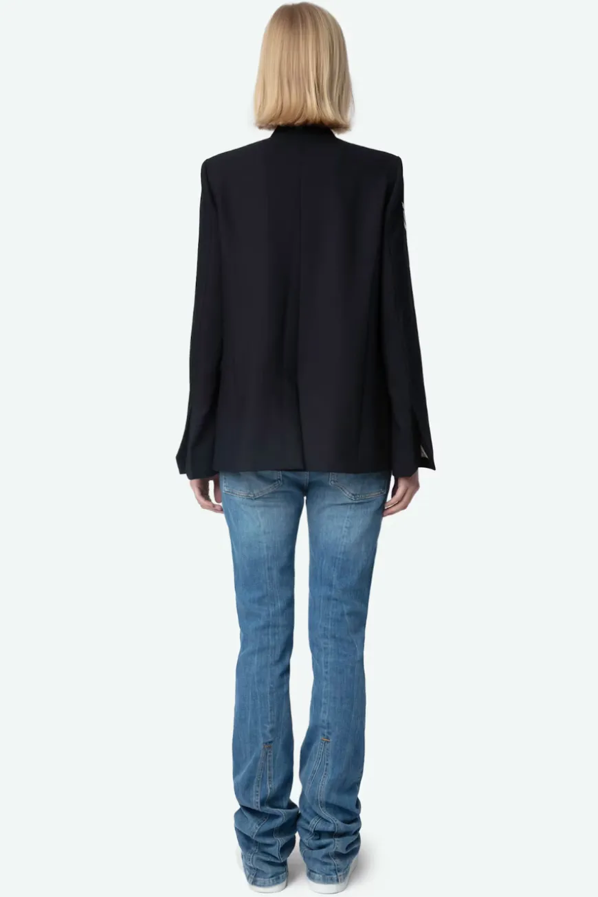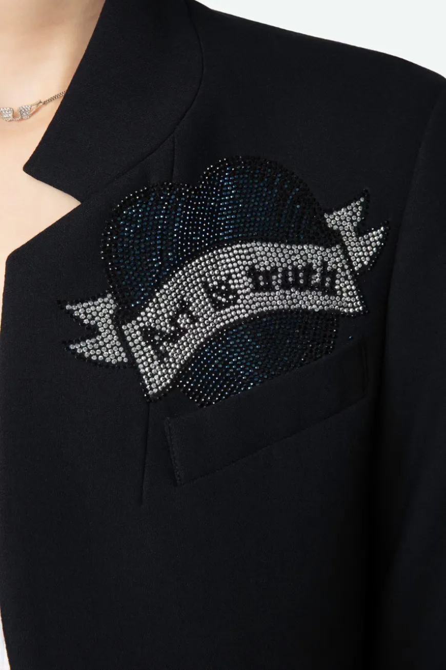 Zadig u0026amp; Voltaire women’s blazer, no buttons, collar with dart, embellished with rhinestones.
