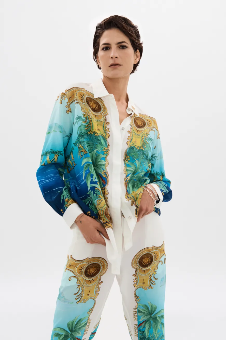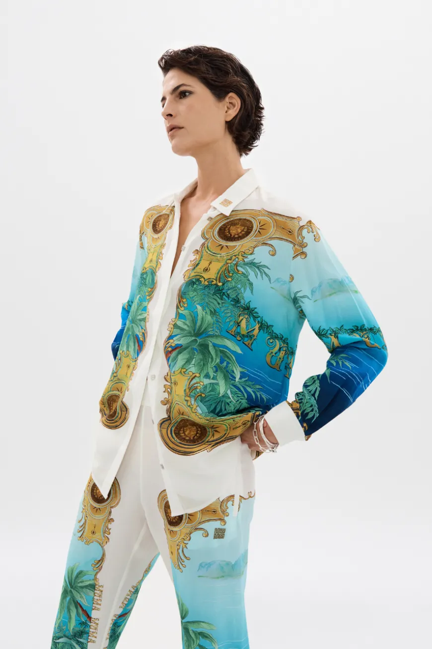 Exuding an opulent u0026amp; luxurious aesthetic with its vintage, cigar-styled print, we introduce the Blue Cigare Story. Ornate contextual motifs border the waters u0026amp; tropical greenery of the Vinales Jungle. Set in 100% Organic Certified silk, the soft, luxurious texture drapes elegantly, providing both comfort and style. Featuring a relaxed fit and a custom button-down front, it is a sophisticated statement piece for those who appreciate artful designs with a nod to classic luxury. Intricate geometric embroidery on the cuffs further accents the unique and refined statement, a one-of-a- kind, limited edition piece designed for you to travel u0026amp; transcend.