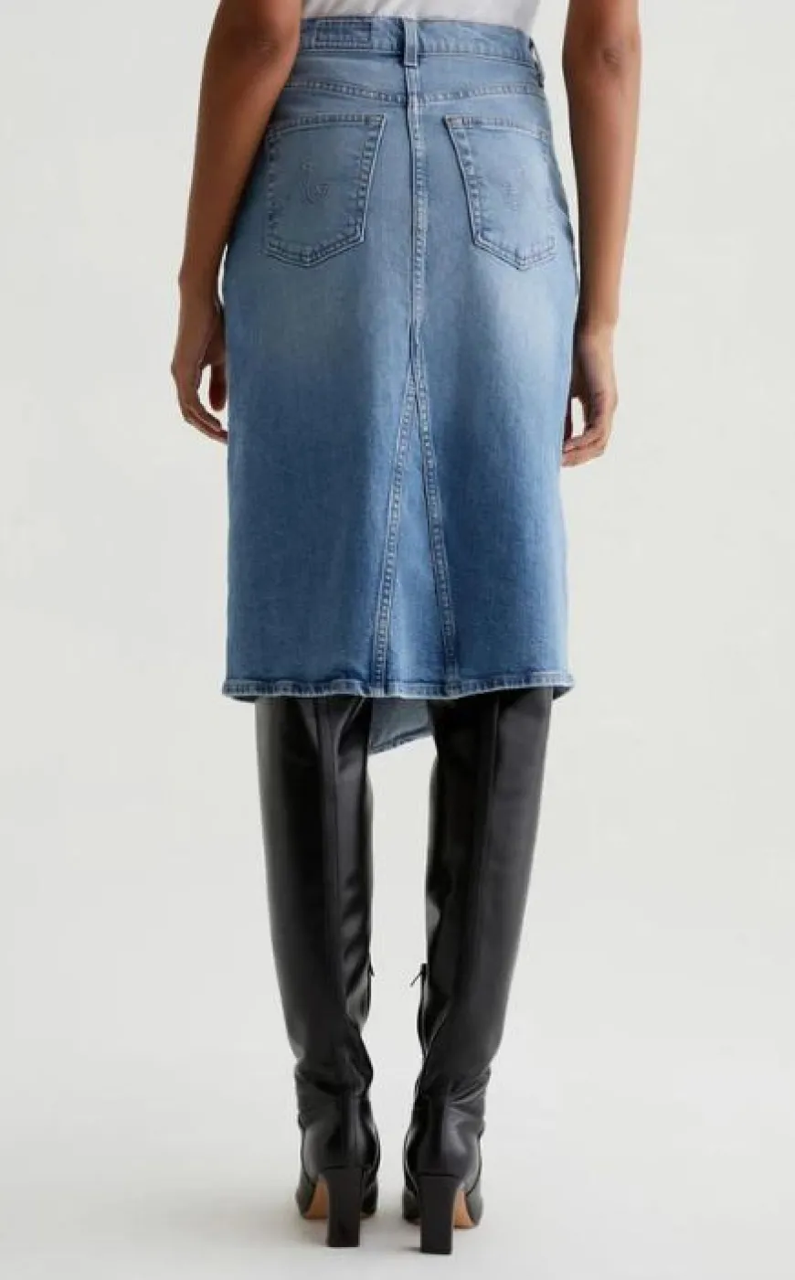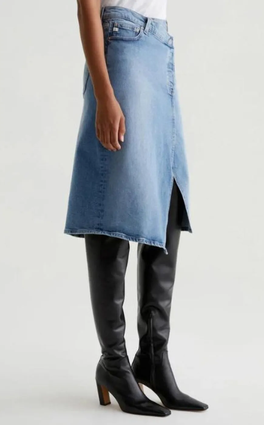 A twist on the classic wrap skirt. Our Bruna denim midi skirt utilizes traditional five-pocket details in a deconstructed design with an asymmetrical wrap-front button-closure and an alluring front split. Made from 11.75 oz. Vintage Comfort Stretch Denim, the style comes in a light-blue wash with an allover AG-ed™ fade that emulates 18 years of wear. Finished with a godet at the back for added shape and room to move.