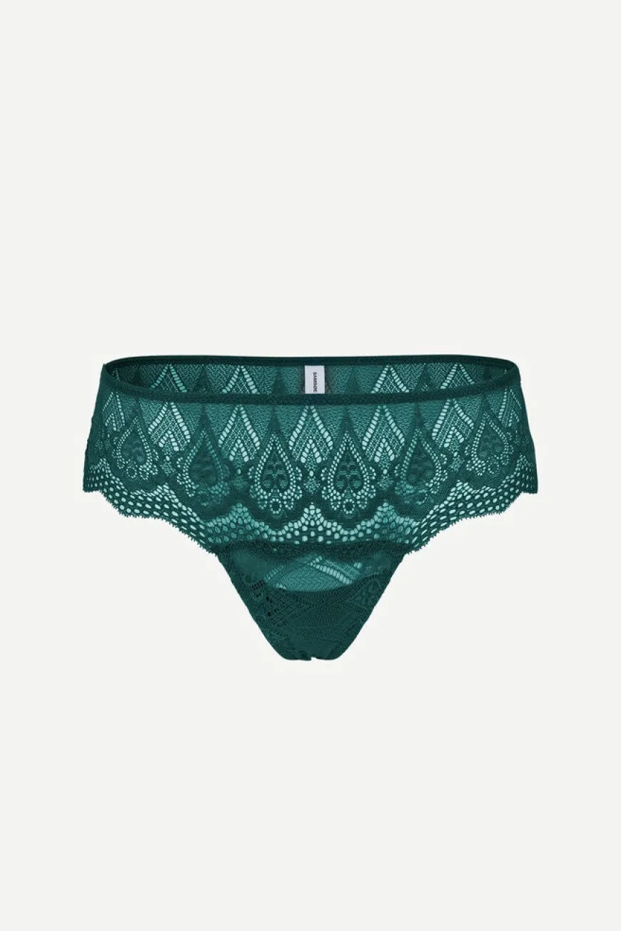 String cut lace panties with wide lace panels on the hip. Scalloped lace edges, elasticated waist. Cotton jersey fabric insert. Polyamide and Elastane stretch lace fabric.