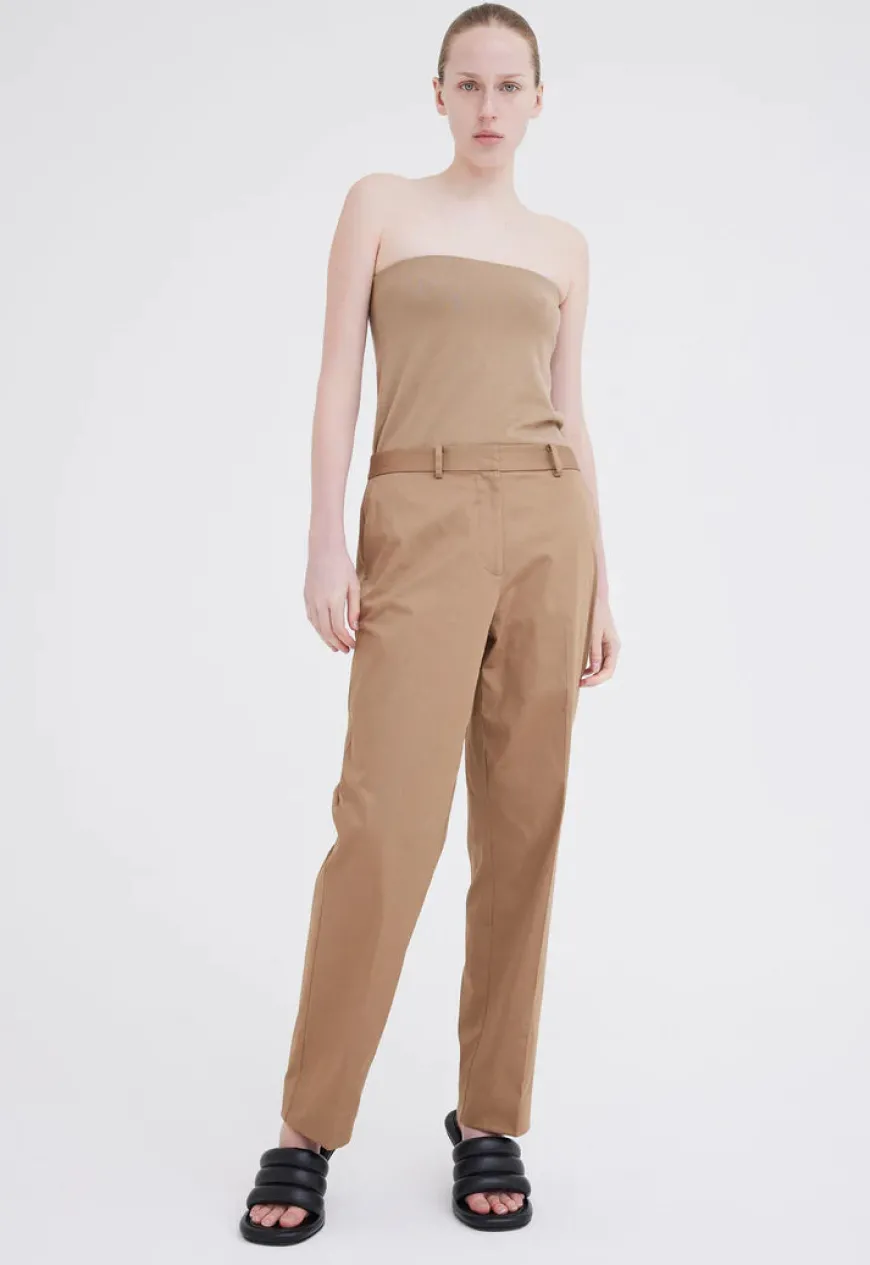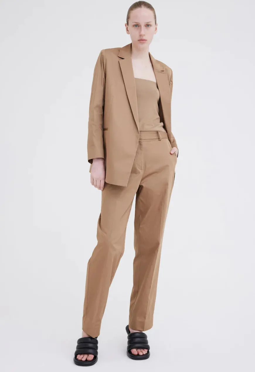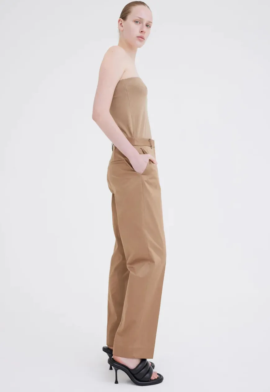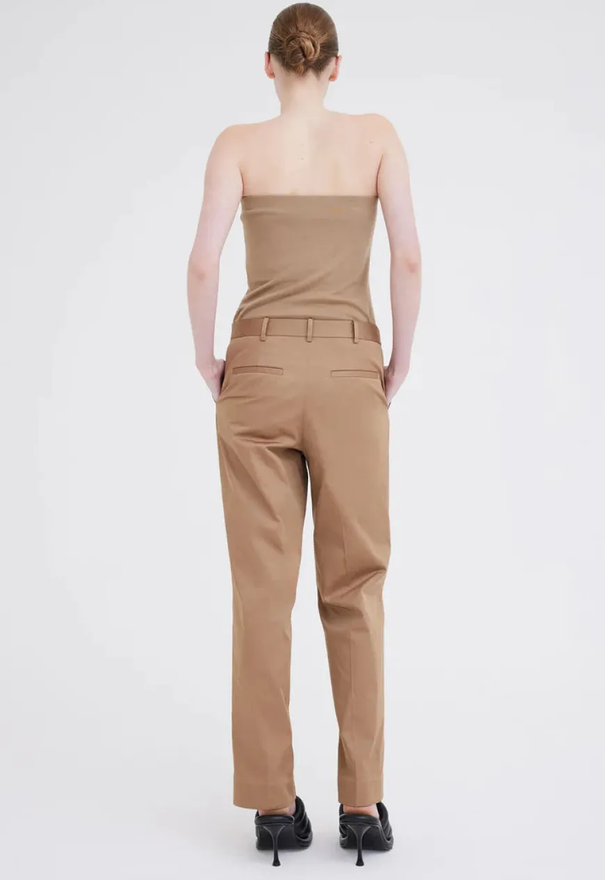 A relaxed suit pant with a modern appeal. These man style trousers are crafted from an Italian fine sateen suiting that is made from 100% cotton. With a low rise waist, flattering straight cut leg and tailored waist band, the compact weave sateen adds structure and sheen for a sharp approach to summer suiting.