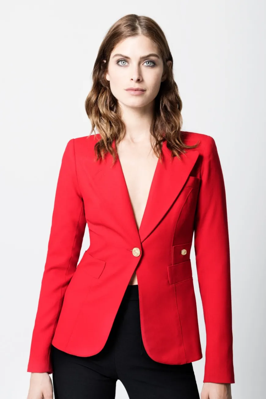 Details: Decidedly tailored and one of our top selling silhouettes, this single breasted blazer features a “cheeky” cut out back vent and brass hardware.