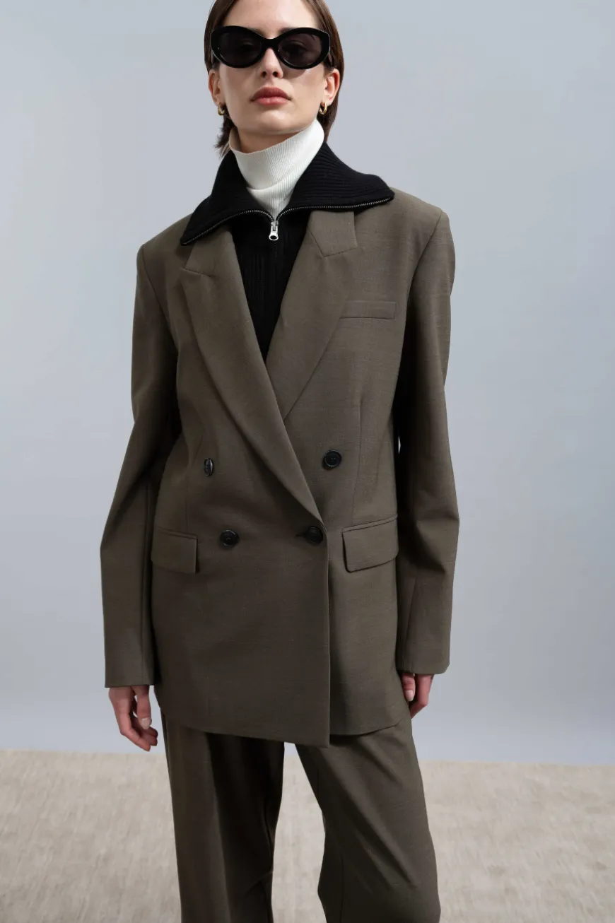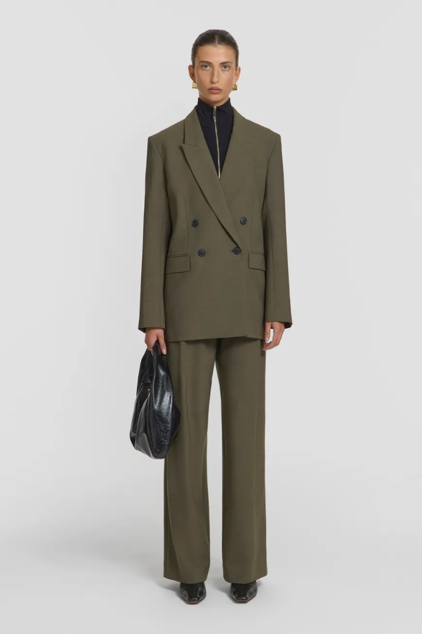 A modern addition to your workwear rotation, the Crossroads Blazer is crafted in khaki green, merging classic tailoring with a fresh perspective. This double-breasted silhouette features a peak lapel, front welt pockets, and a centre back vent, finished with contrast black buttons. Pair with the Brooklyn Trouser or Townes Skirt for a statement suiting moment.