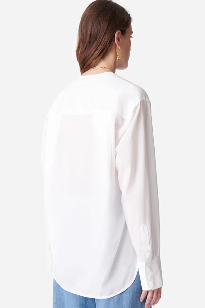The Danny Shirt is the only shirt you need. Featuring an oversized straight cut, this blouse is perfect for a play of masculine-feminine contrasts. Enhanced with a Tunisian collar and tone-on-tone bib, it adds a touch of minimalist sophistication. Its airy fabric, made from a soft cotton blend with a silky touch, brings a feminine touch that can be highlighted as you wish. Don’t hesitate to oversize it if you want an even more oversized look. Wear it under a suit for an office outfit or with fitted Bermuda shorts for a casual and chic look.