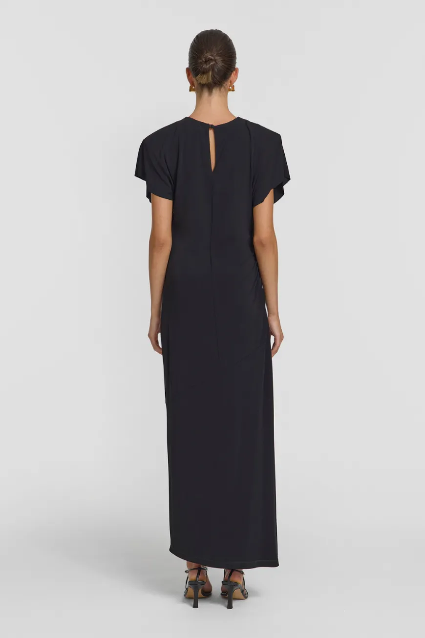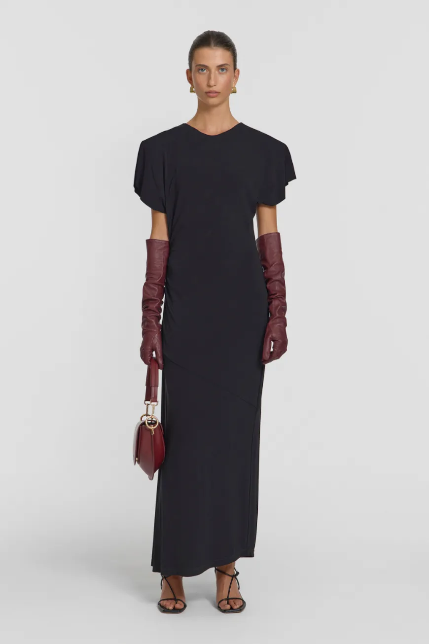 Embody serene elegance with the Daytona Dress, an event-worthy silhouette in classic black. Subtle shoulder pads and softly draped sleeves complement its gentle side gathering for a flattering, body-skimming fit. A raw sleeve hem and keyhole opening at the back lend a sophisticated finish, making this dress a standout choice for your next occasion.