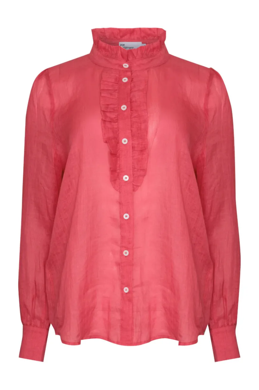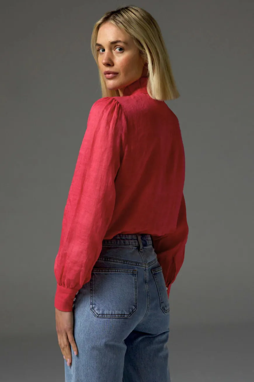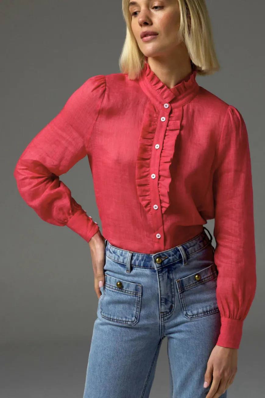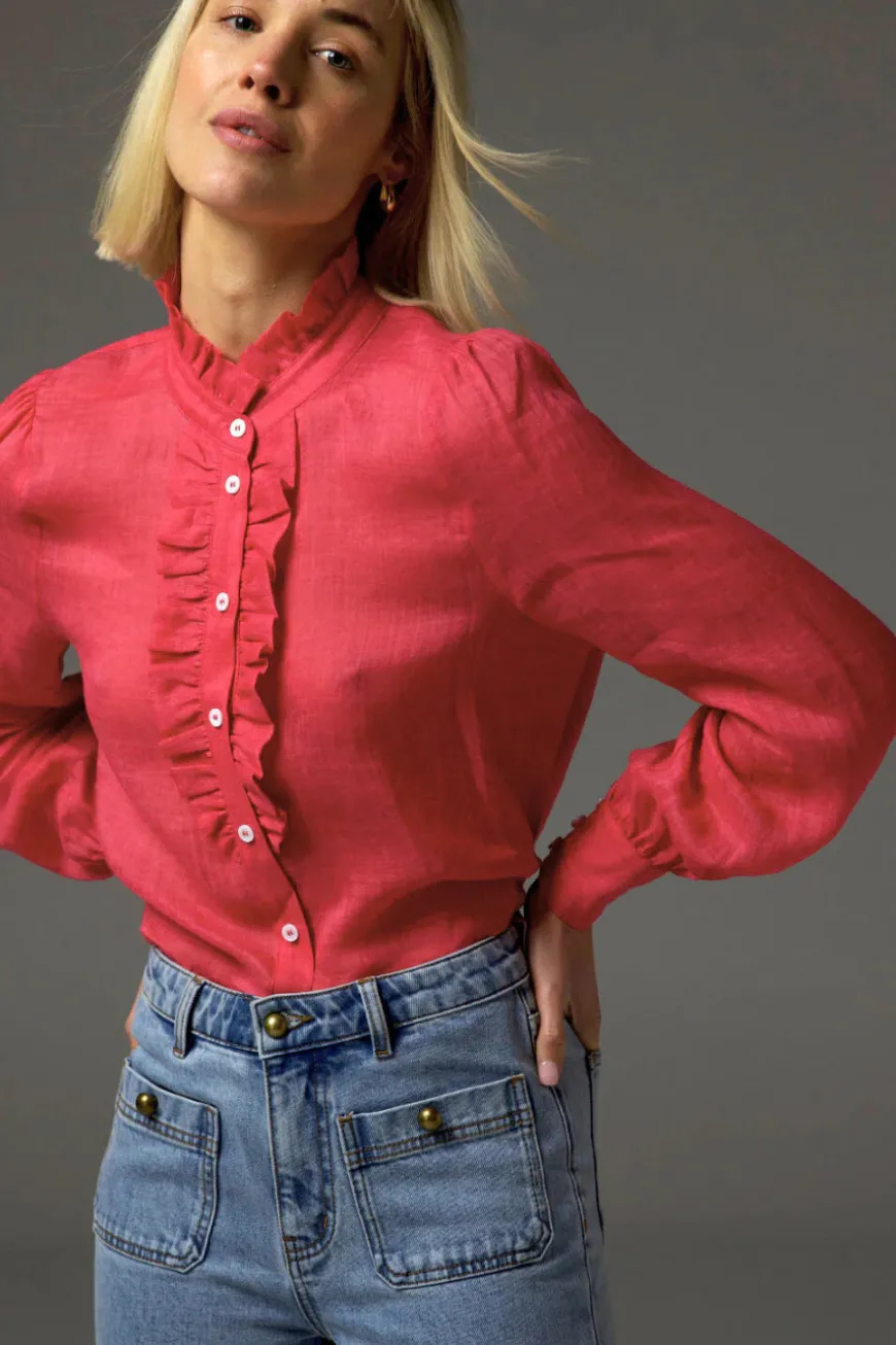 Ethereal yet everyday, the Dialect Top is crafted from lightweight cross-dye ramie, blending softness with structure. A curved ruffle neckline and delicate ruffle details along the bodice offer just the right amount of femininity, while contrasting shell buttons introduce subtle texture. product details below.