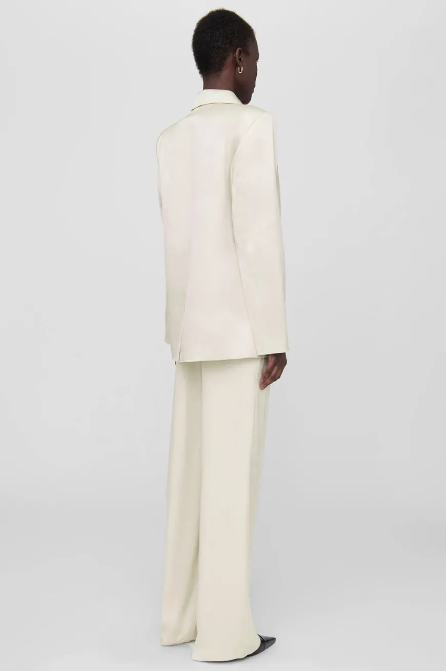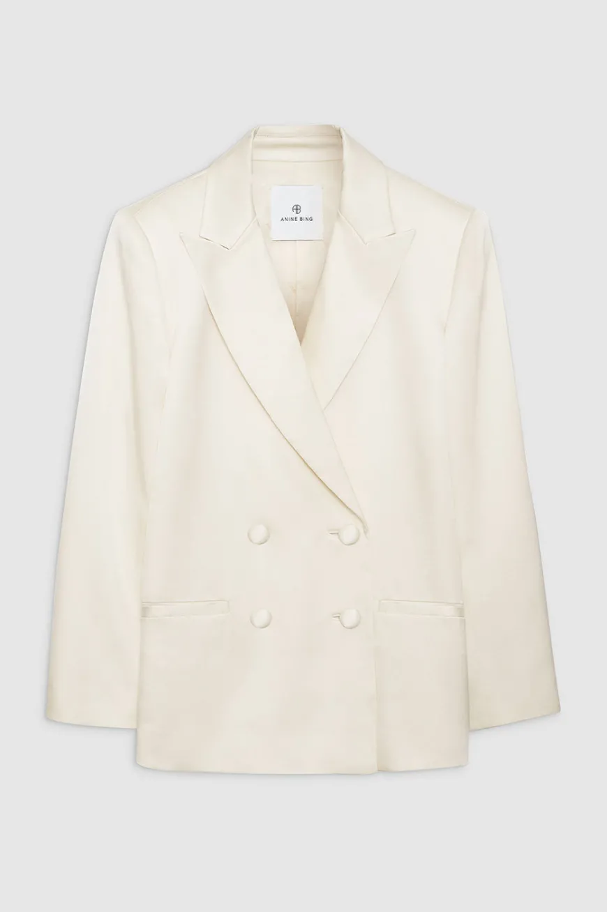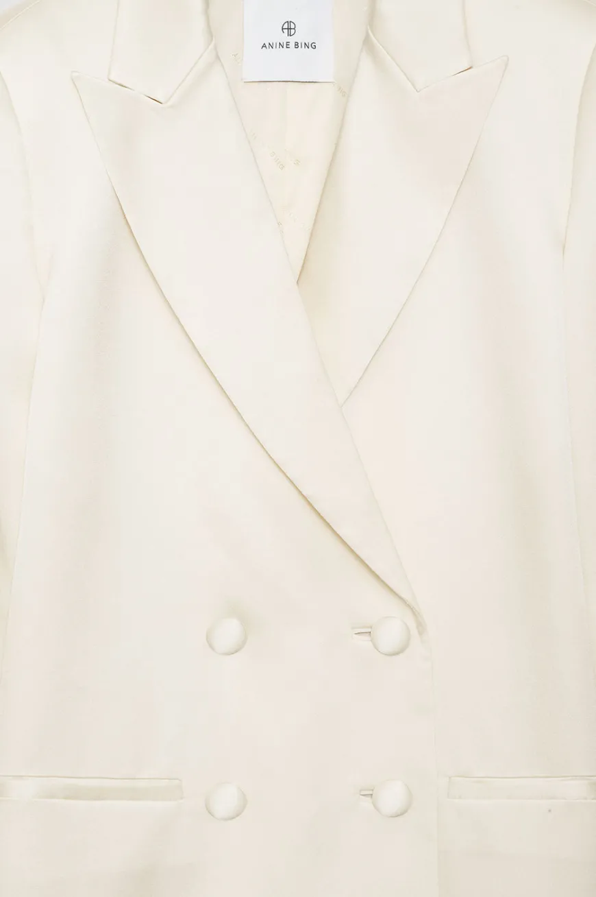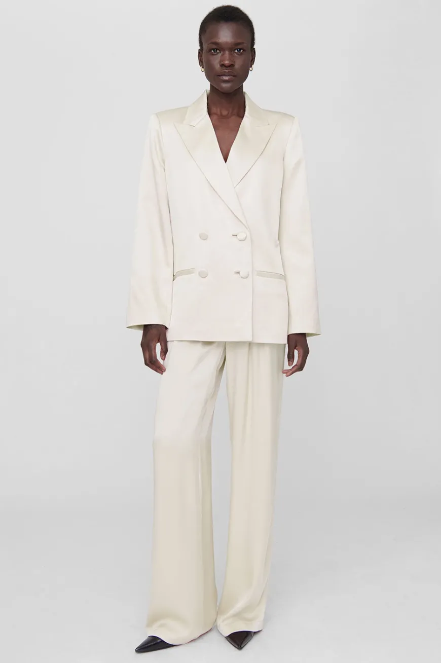 The Donne Blazer in oyster is crafted from light and drapey 100% silk. It’s fully lined featuring a double-breasted closure with four self-covered buttons at the center front, two welt pockets, internal shoulder pads, and a formal peak collar.