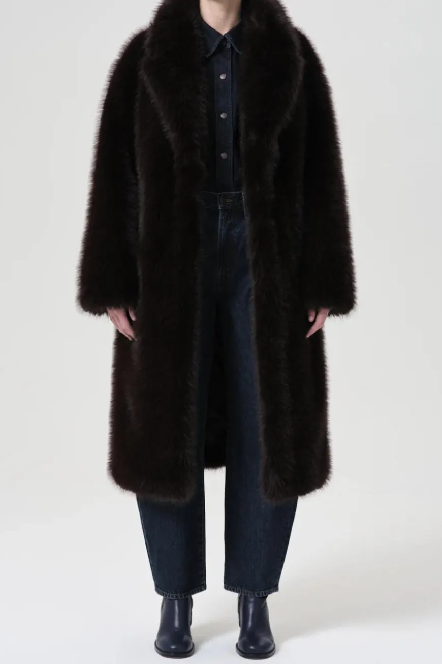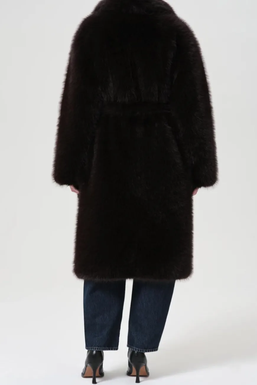 The Ebony Shearling Coat is guaranteed to make a statement. Designed with long length, generous proportions and plush, voluminous feel. This silhouette is made from faux shearling and radiates glamorous sophistication.