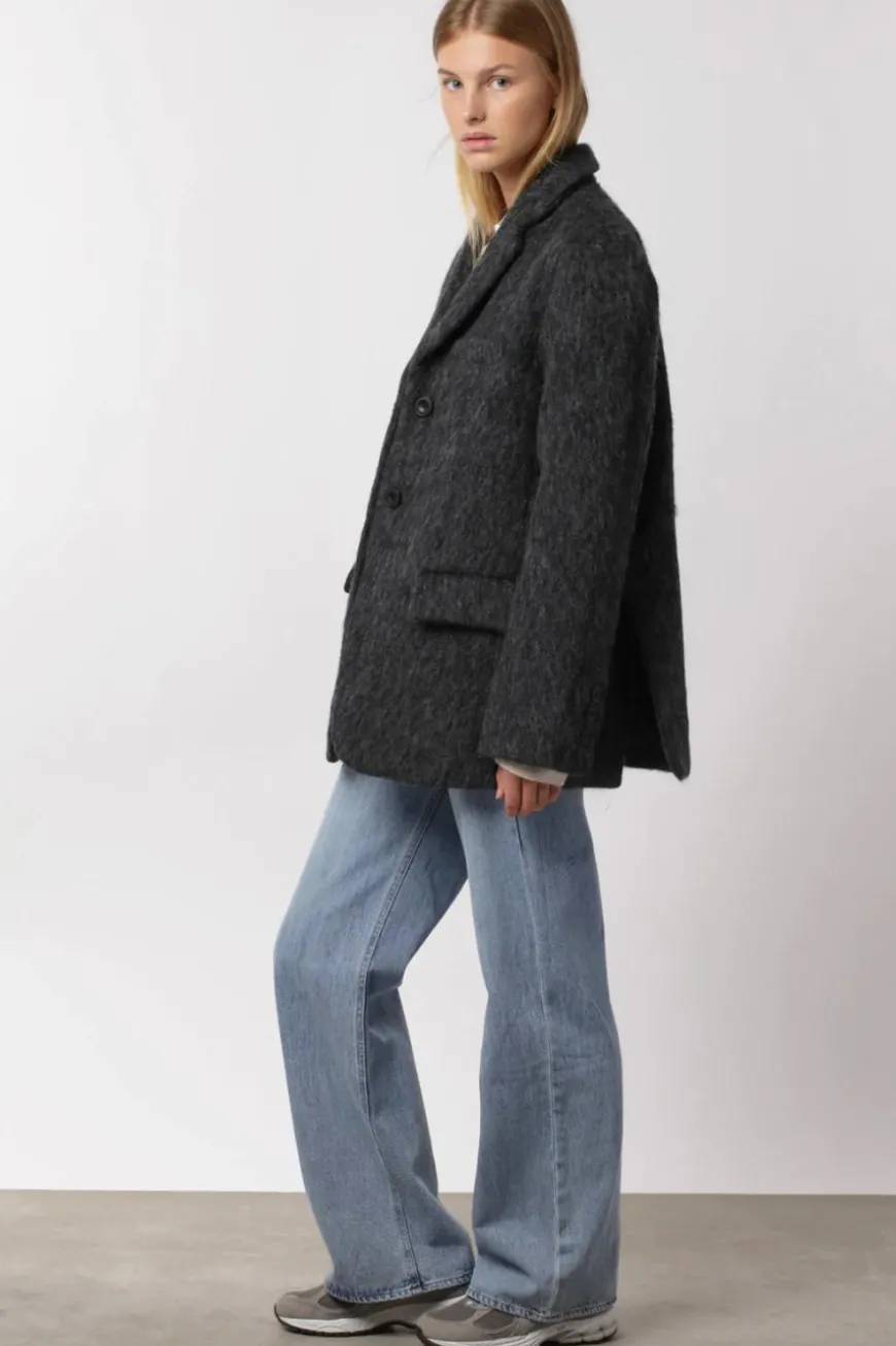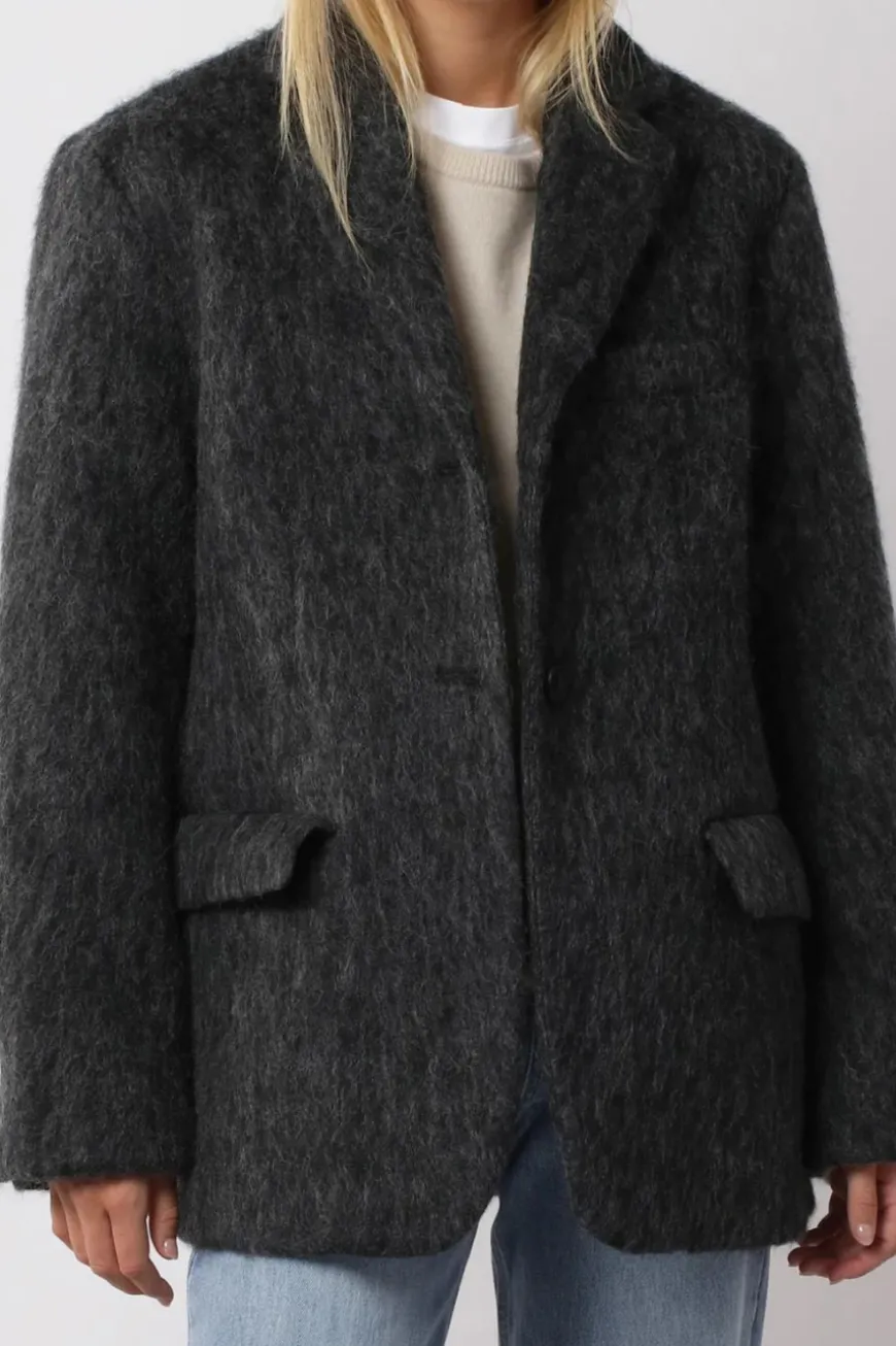 The Emily is a relaxed fit blazer cut from mohair wool. It is designed with a thin lining, sharp cut collars, button closure and two hidden front pockets.