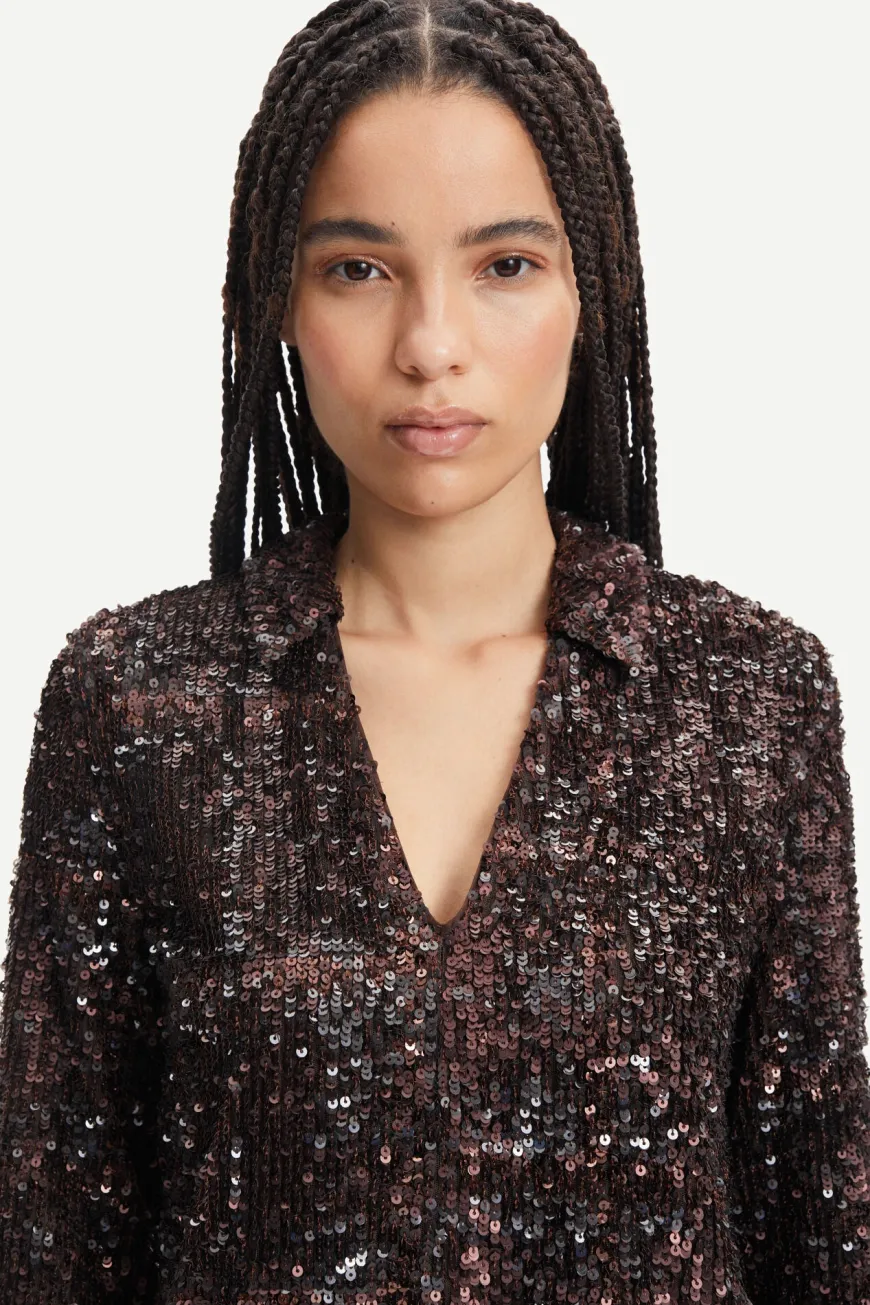 Easy fitting short sequined dress with a slight A-line silhouette. Long sleeves, open neckline with collar. Lined.