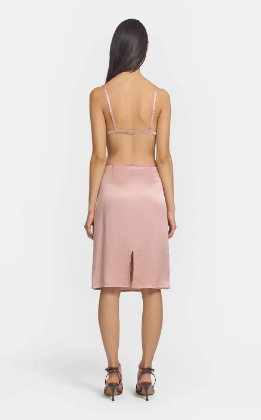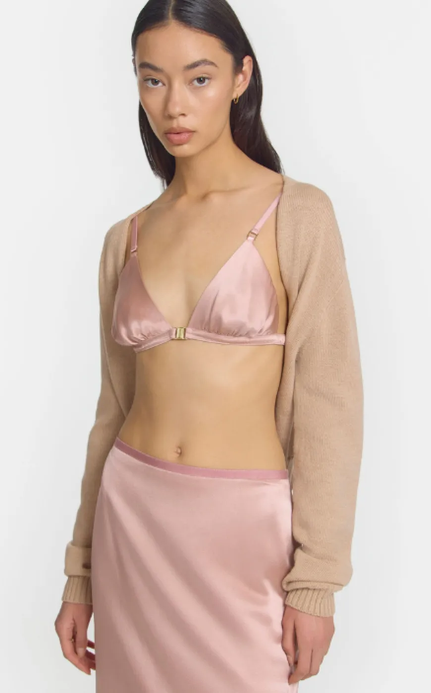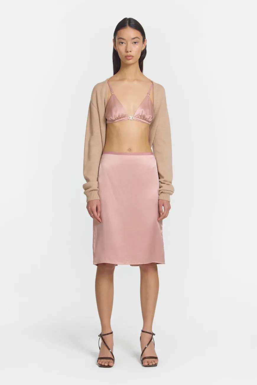 Crafted from luxurious silk, the Forecast Bra offers a sophisticated triangle bralette design. Enhanced with yellow gold hardware, it exudes refined elegance. With a wide gathered elastic casing under the bust for comfort and support, this piece is the perfect undergarment for sheer ensembles.
