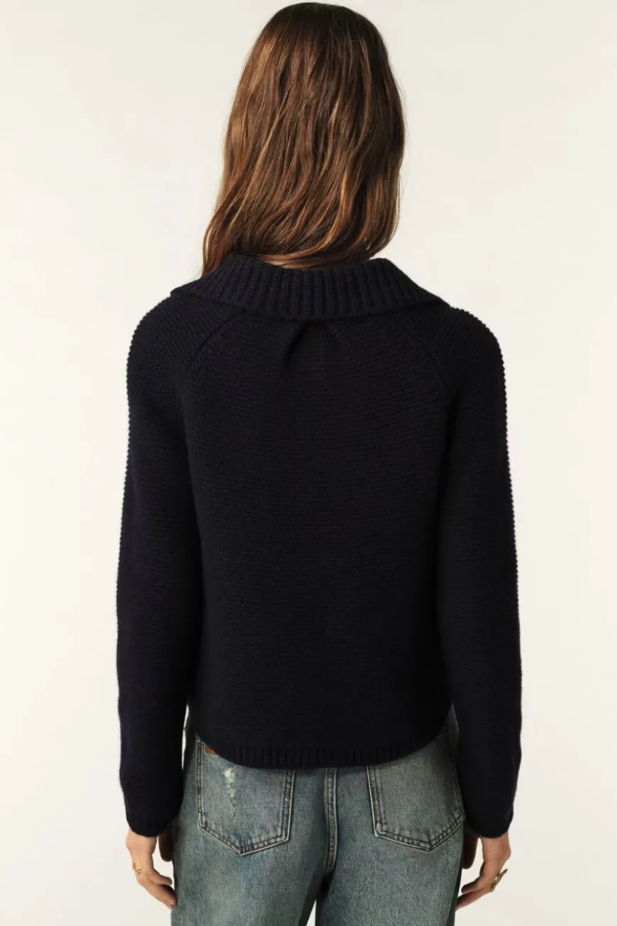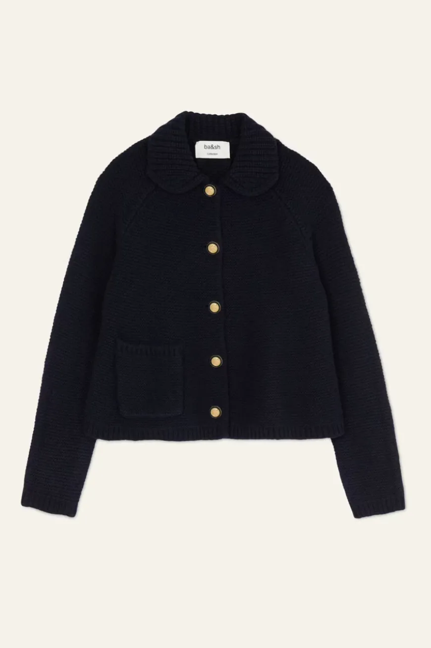 Navy button cardigan with cropped design, long sleeves, Peter Pan collar, buttoned closure, and ribbed edges.