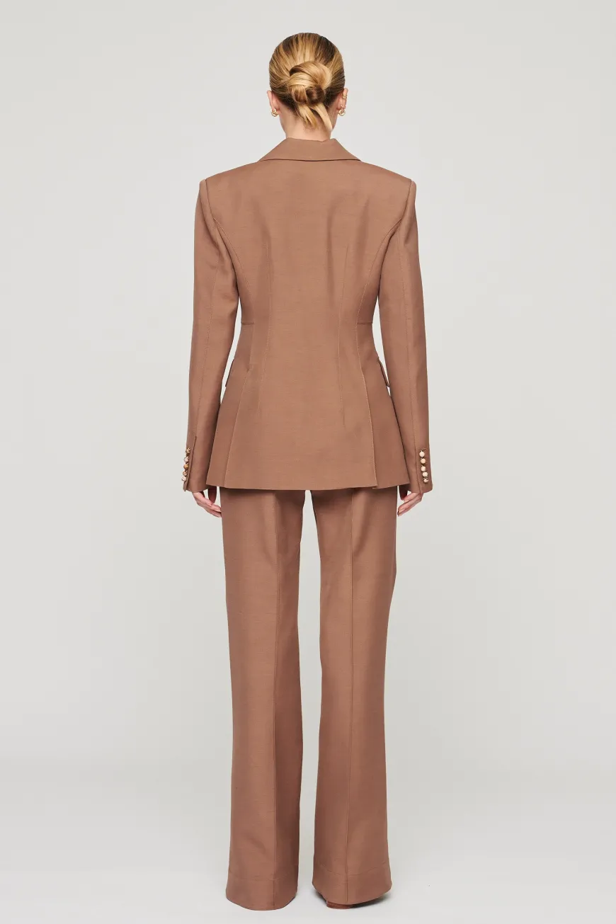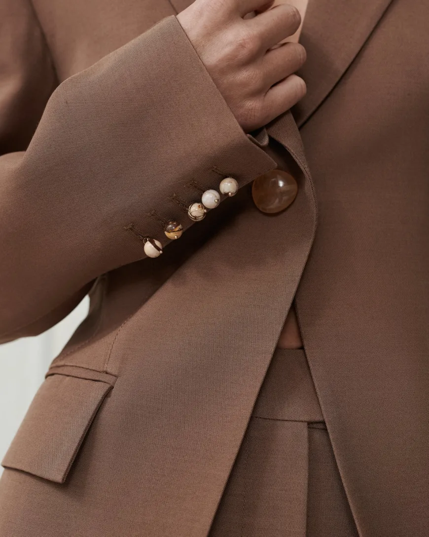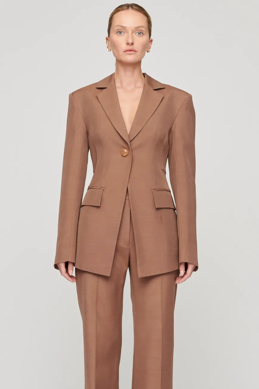 Features a notched lapel; button closure at front. Concealed shoulder pads and long sleeves further compliment this blazer; button details are featured at cuff. Two flap pockets are found at waist and a double-vented hem finishes the look.