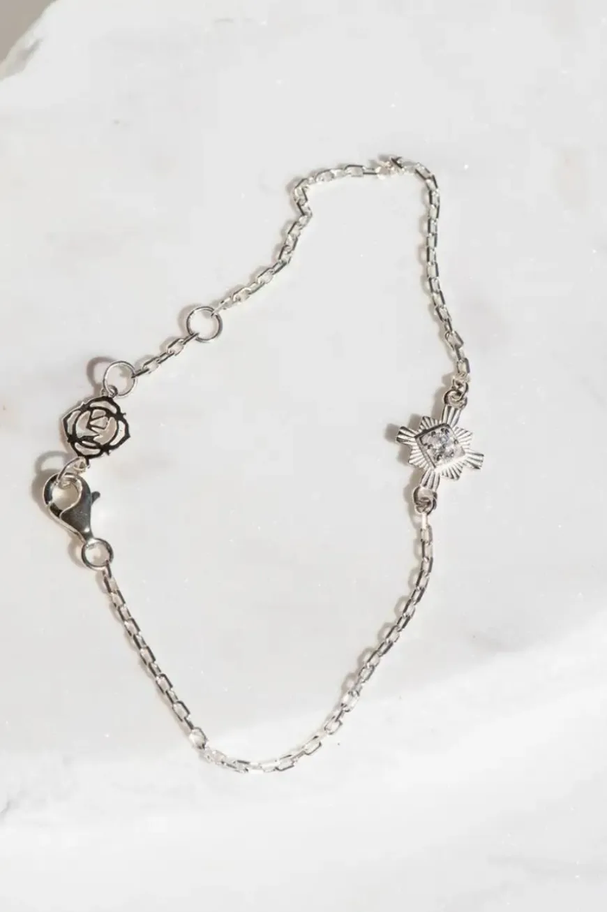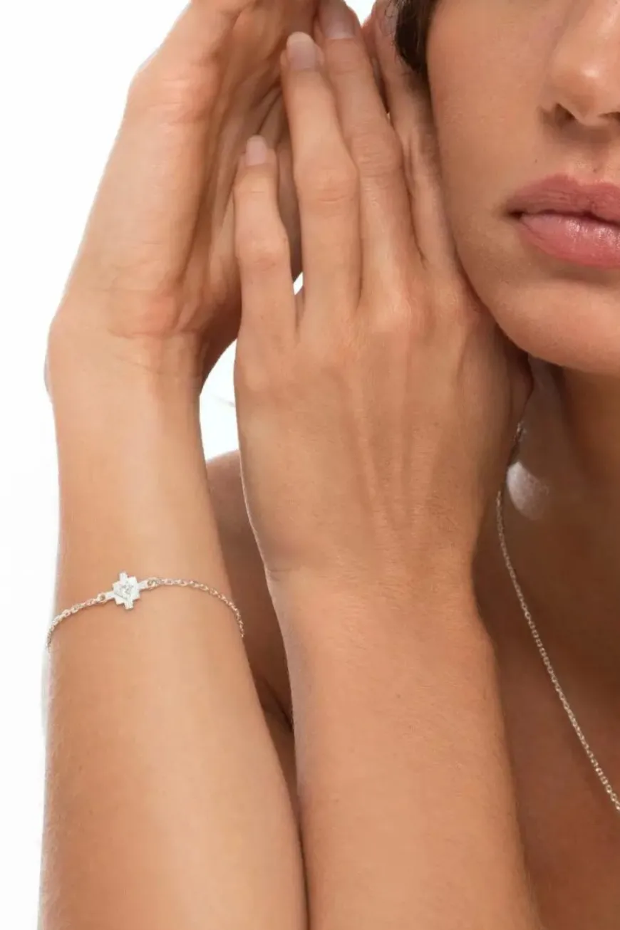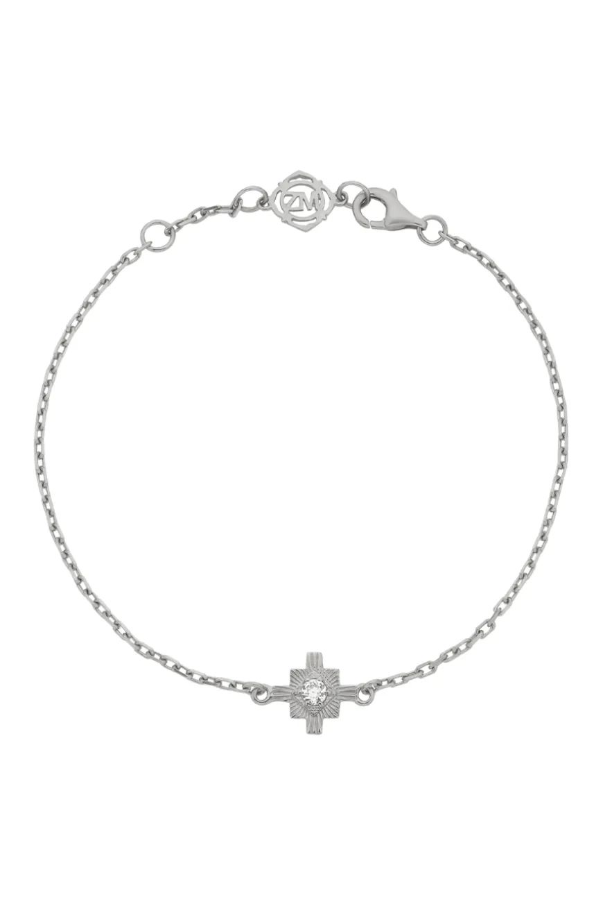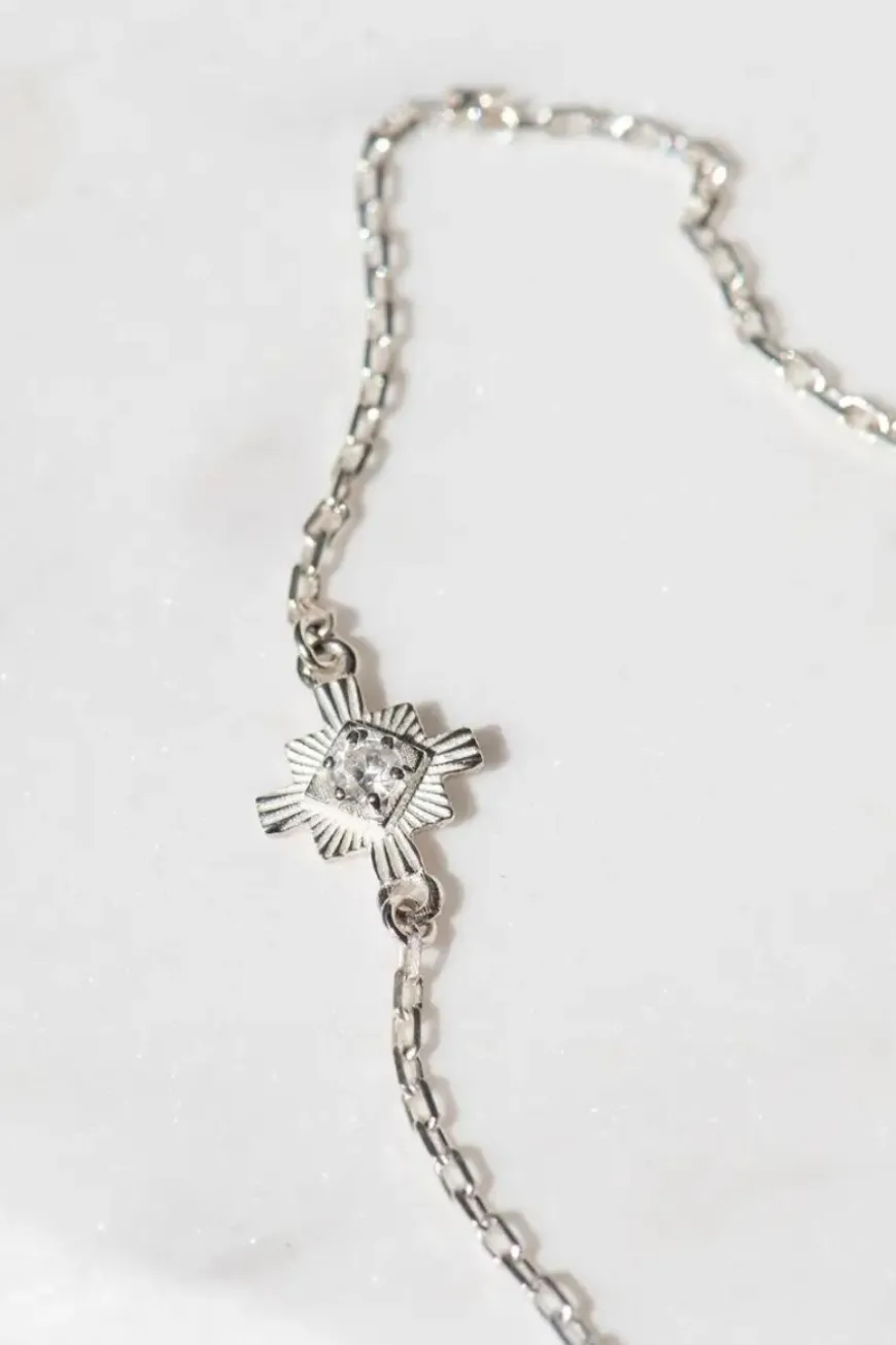 Inka is a delicate bracelet with a small stone nestled into the centre. Inspired by the strong focus on the 4 directions – commonly referred to as the compass points in Native American culture. Particularly in Inca culture, there are various manifestations of these types of forms. This bracelet is a homage to the more simple form of compass points and the symbol of orientation.