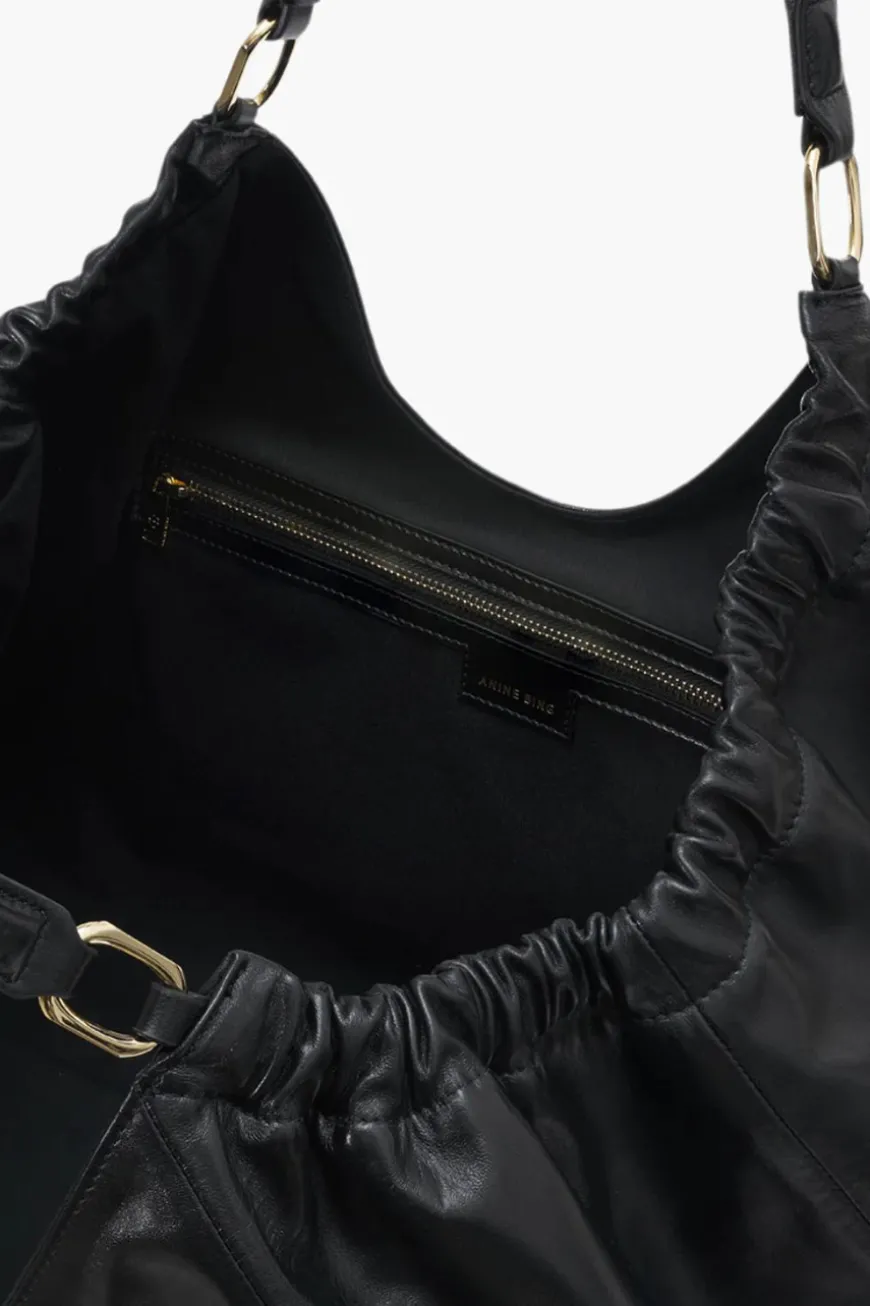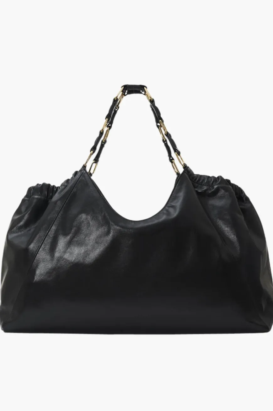 The Kate Tote is constructed from thin, slightly crinkled 100% nappa leather. This iconic handbag features a strap made of interlocked signature links in gold-tone hardware. Its oversized, carryall construction features elastic ruched side openings to reveal a large compartment with a single slip pocket and large zipper pocket. Finished with an embossed ANINE BING monogram at the front.