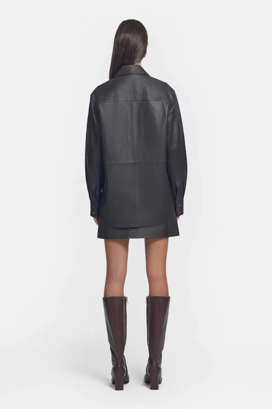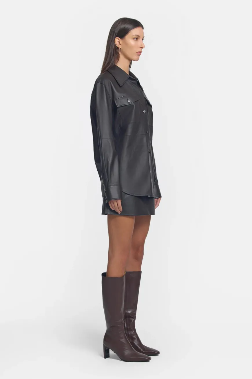 Introducing the limited edition Kingpin Leather Shirt, crafted from genuine Leather Working Group certified leather in a rich chocolate hue. Exuding sophistication with its traditional shirt collar, centre front placket, and sleeve cuff design, this timeless piece offers effortless style and versatility in its relaxed shacket shape. Pair it with the Camaro Leather Pant for a chic ensemble radiating effortless cool.