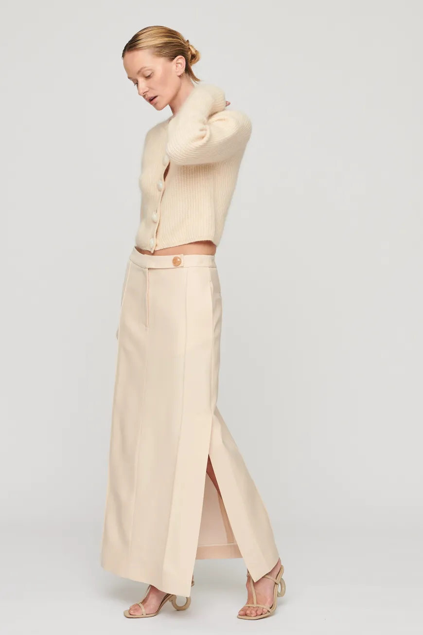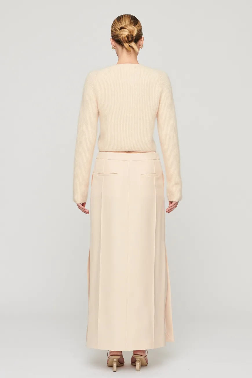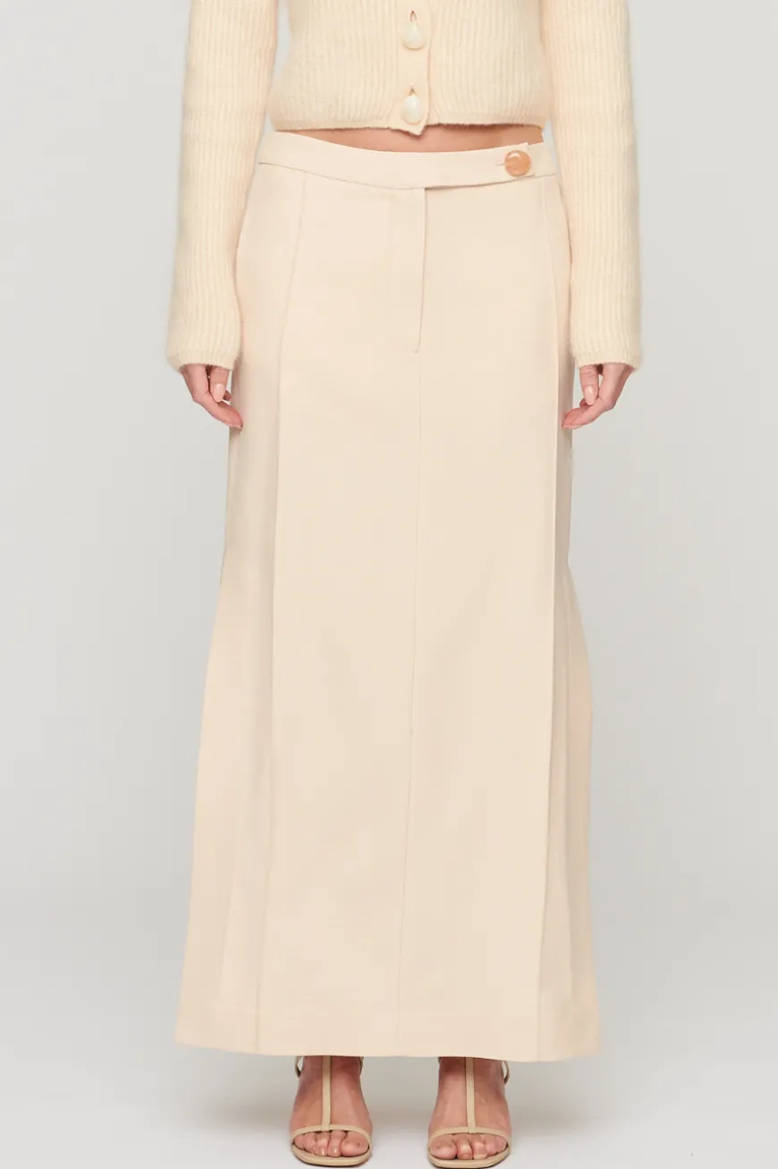 This Kingston Pintuck Skirt Macadamia features a straight midi length with splits on each side. For a sophisticated look, pair it with the matching Holland Blazer.k.