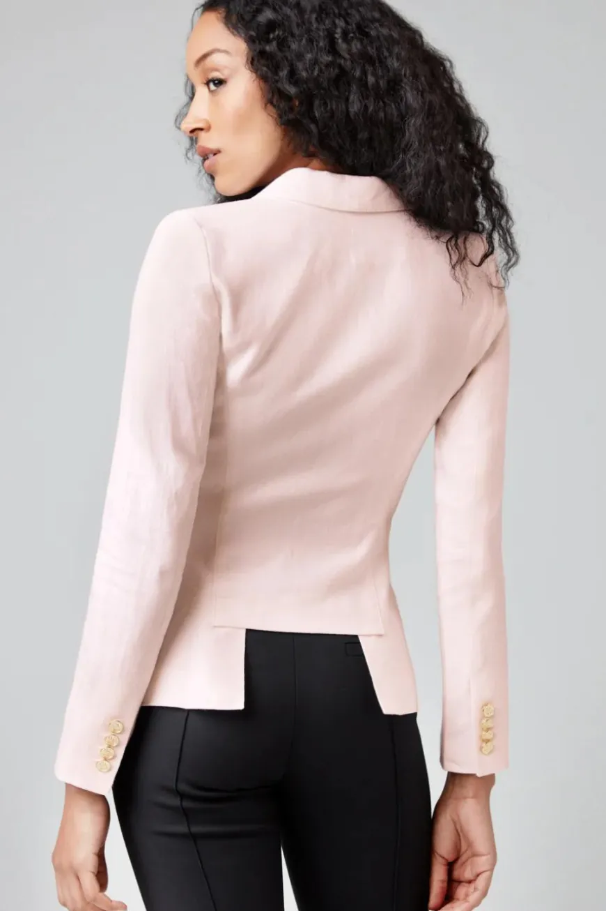 This blazer is quintessentially SMYTHE: refined and perfectly tailored. This timeless classic has been a SMYTHE staple since 2011. Perfectly tailored and one of our top selling silhouettes, this single breasted blazer features a “cheeky” cut out back vent and brass hardware.