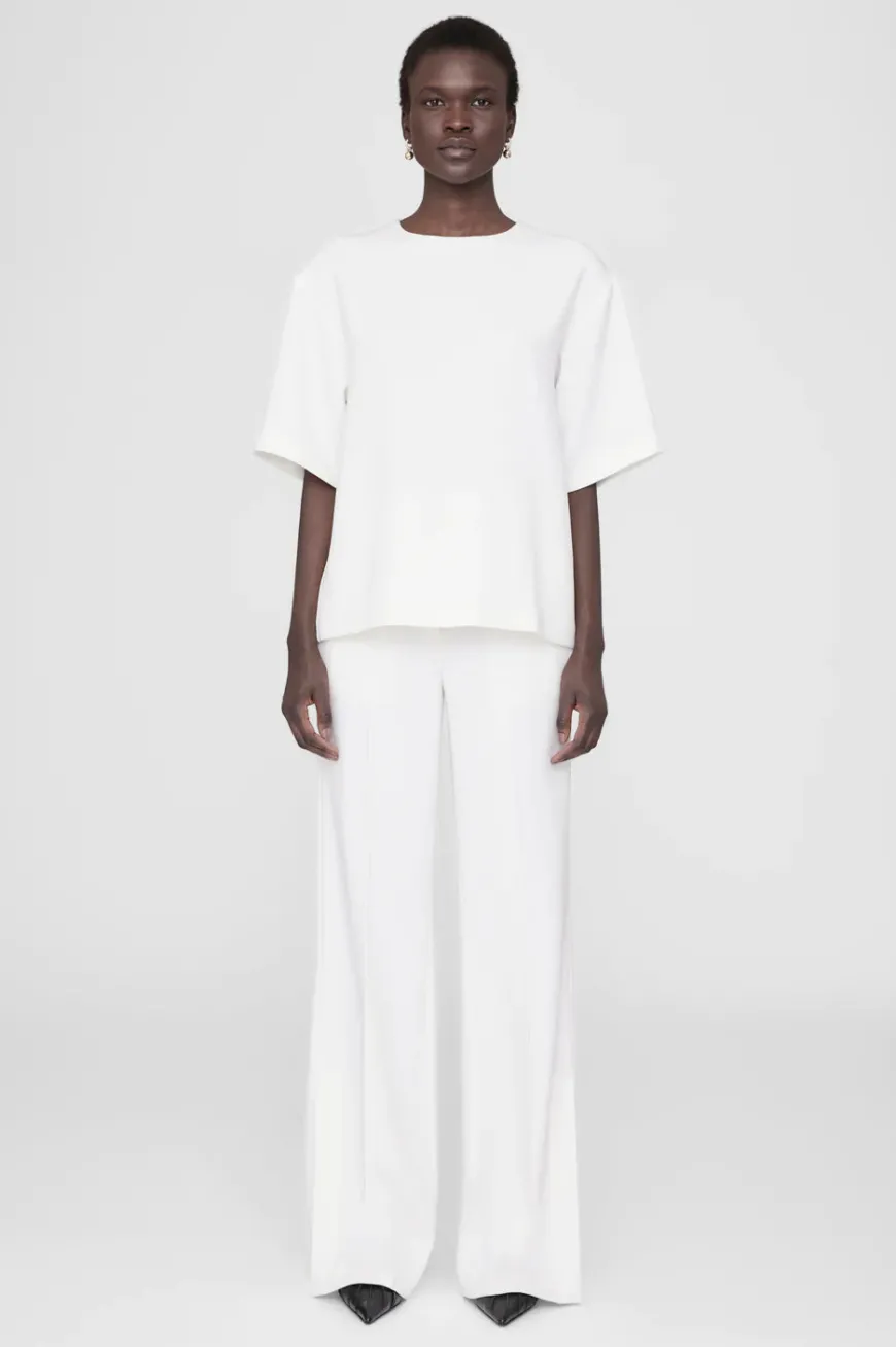 An oversized T-shirt elevated in a soft textured crepe fabrication. This everyday style features a clean crew neckline, wide elbow-length sleeves, and an invisible zipper at the back neck.