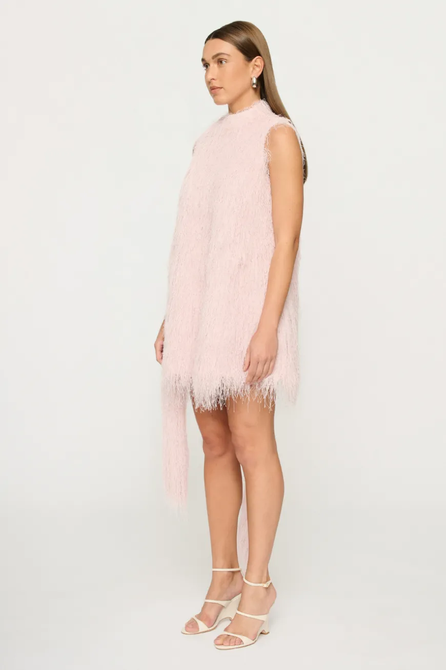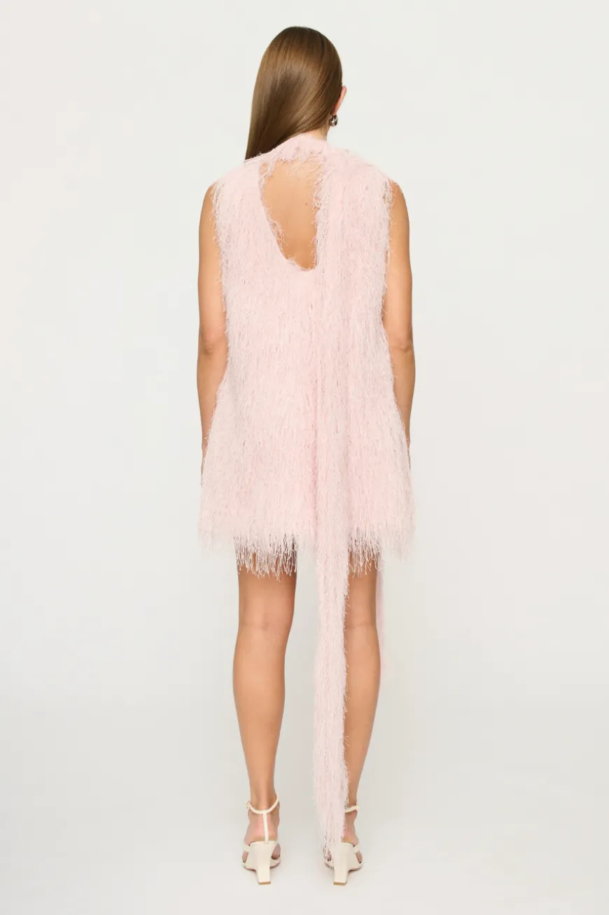 The Mara Fringe Mini Dress is a sleeveless mini with high collar which extends to a longline tie which can be bowed or tied.