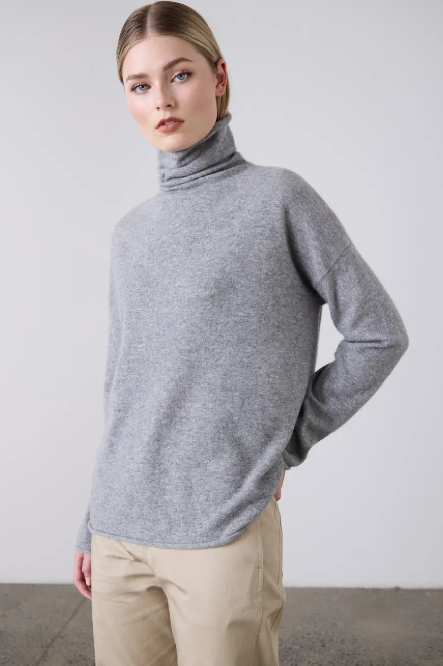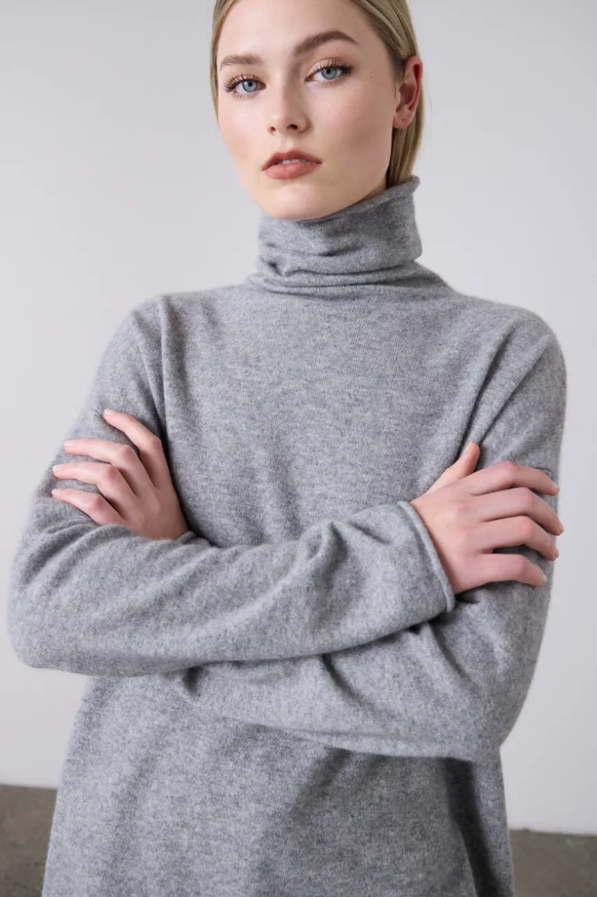 Made from supersoft, pure cashmere, it has simply rolled hems at the cuffs, hem and neck a long funnel neck that can be rolled, folded or left slouchy and a dropped shoulder.