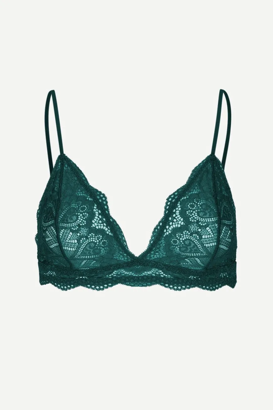 Soft cup lace bra with darted shaping and scalloped lace edges. Adjustable elasticated straps, hook and eye fastening chest band. Stretch lace fabric, polyamide, recycled polyamide and Elastane blend.