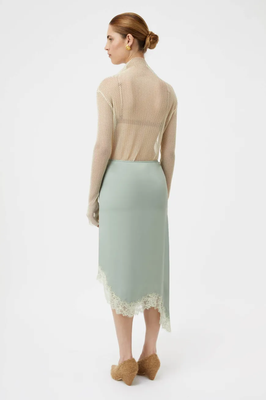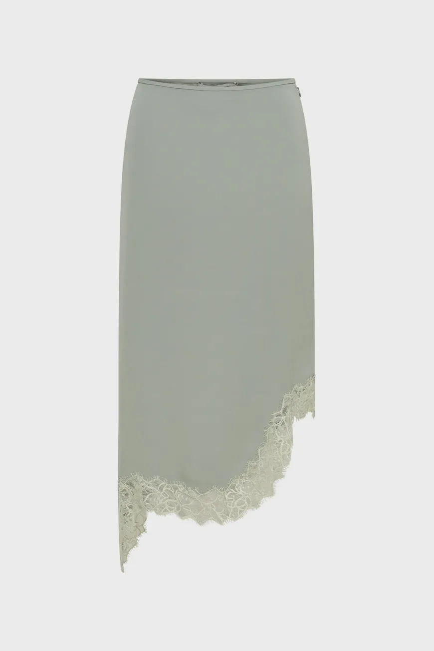 The Melle Skirt redefines contemporary femininity with its exquisite design, showcasing an asymmetrical hem and delicate lace detailing. This midi-length skirt effortlessly captures the essence of modern elegance, offering a sophisticated silhouette that seamlessly transitions from day to night.
