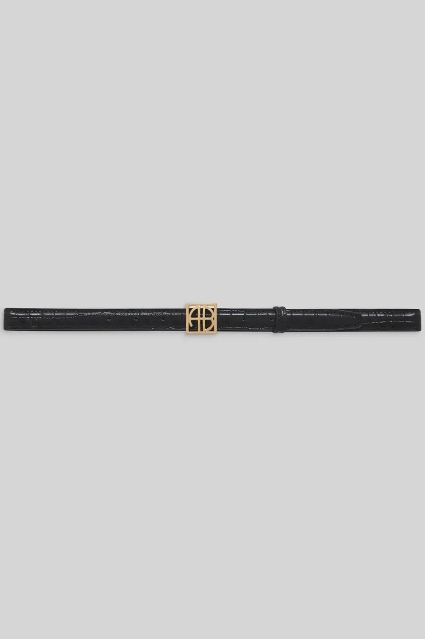 A timeless belt made from 100% leather stamped with faux croco-embossed texture in a high-shine finish. This modern style is elevated with a gold, square monogram buckle.