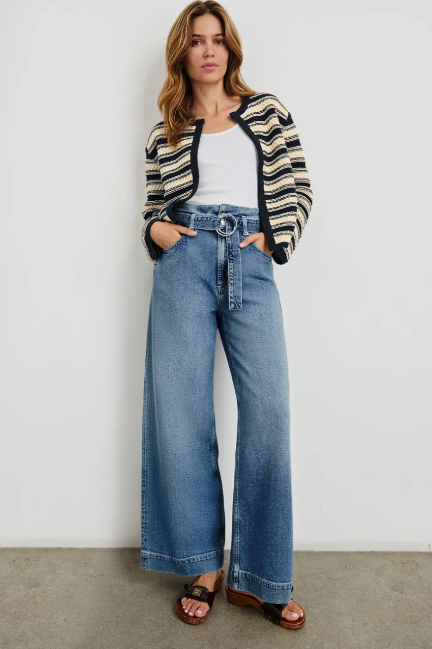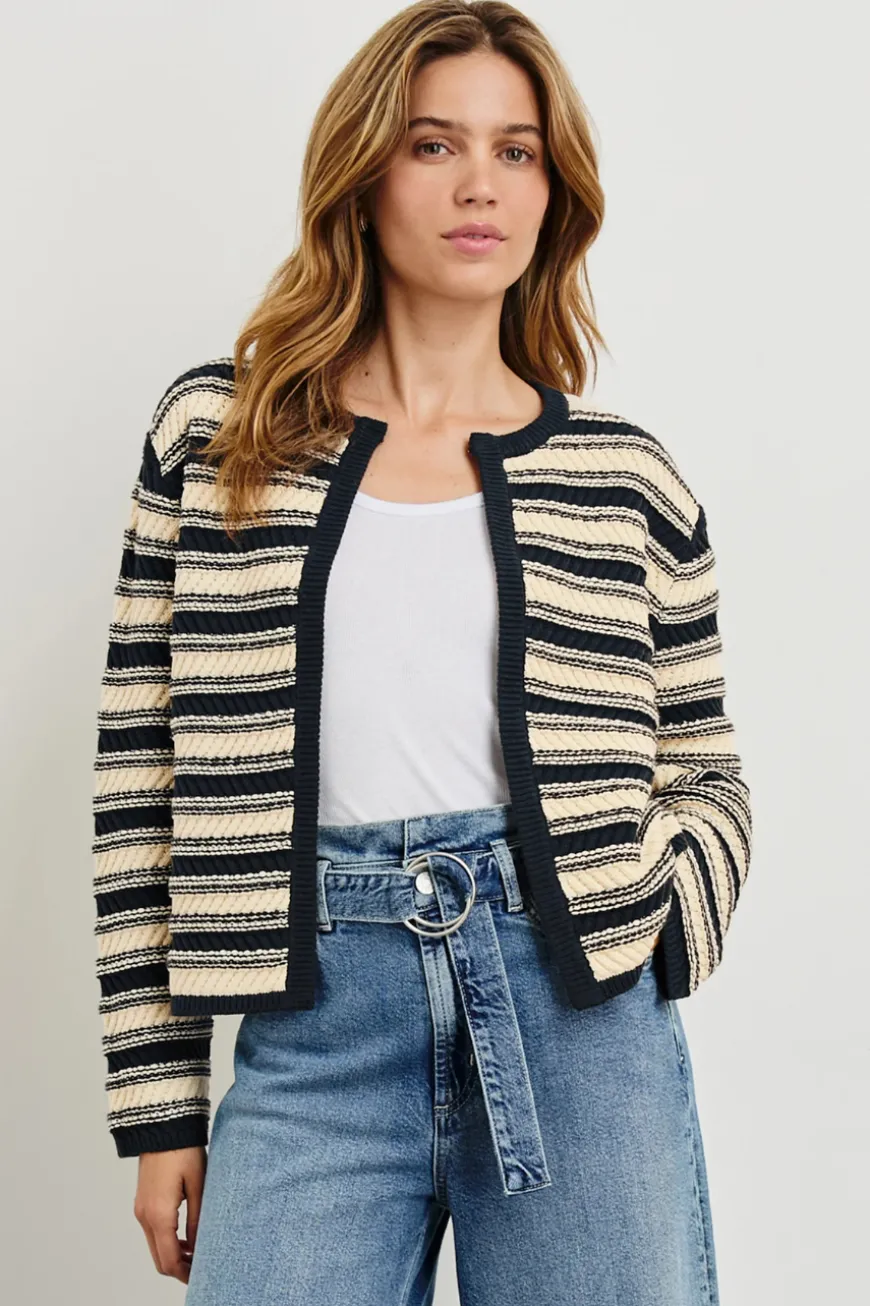 A mid-weight, cotton blend cardigan that makes a case for statement knits. The Nelly has a lady jacket shape, a traditional fit and features contrasting textured stripes and trimming.