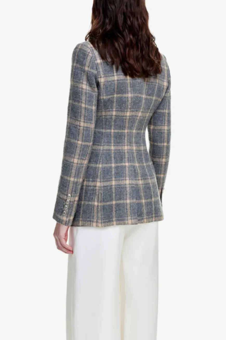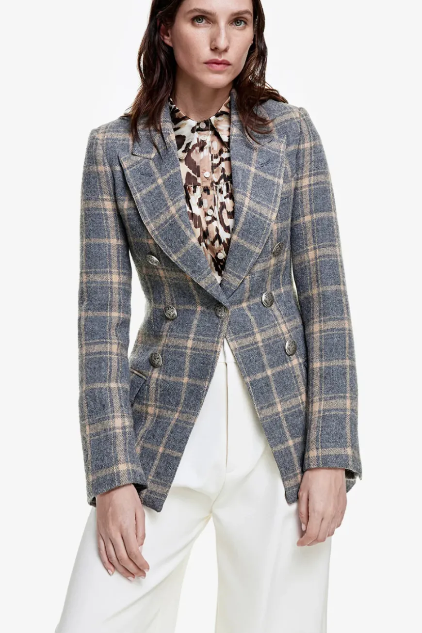 Style Notes: This blazer has all the swagger of a double-breasted blazer but none of the bulk. A lightweight cotton-blend glen check with oversized brass hardware, this sophisticated blazer will take you from patio season right on into fall.