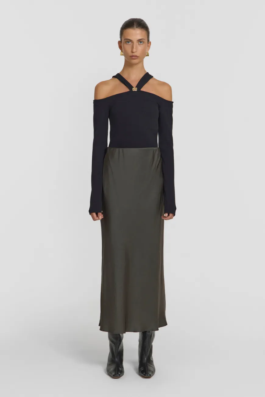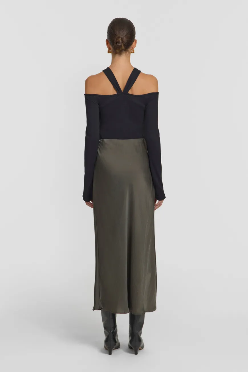 Introducing the Othello Skirt, a sophisticated staple crafted from a cupro blend in a versatile olive green hue. Cut on the bias in a mid-rise, midi-length silhouette, this skirt effortlessly embodies timeless elegance for any occasion. Pair it with this season’s olive green offerings for an effortless tonal look, or style it with Vu0026amp;W basics for everyday wear.
