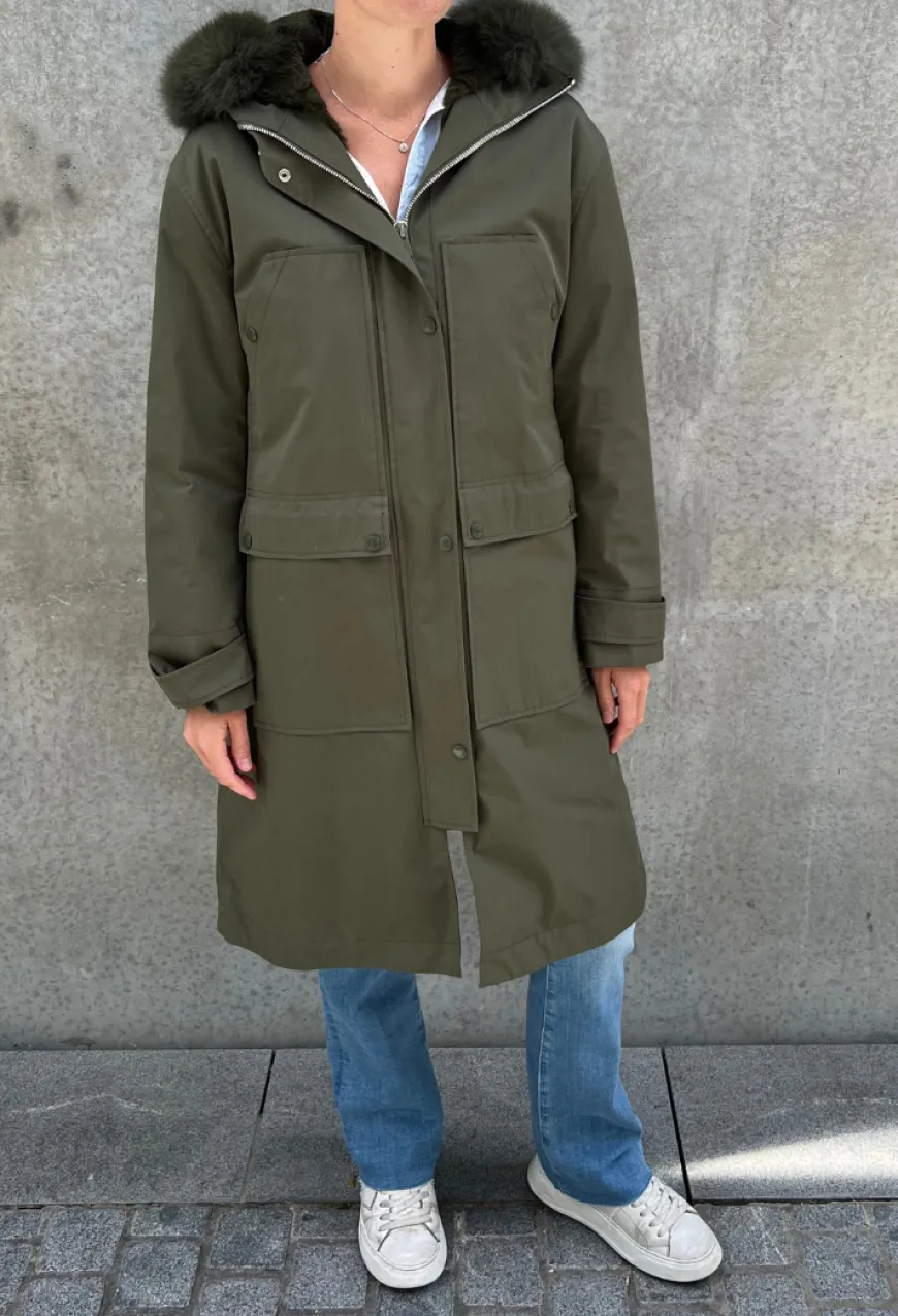This Yves Salomon parka combines a sleek, extended silhouette with a sumptuous fur lining, offering both refined luxury and exceptional warmth for the colder months.