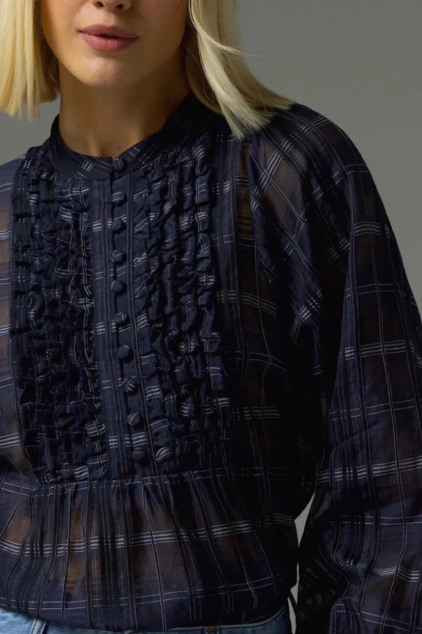 With layers of delicate, gathered ruffles, the Passage is ablaze with luxurious textures. Covered buttons cascade down to a deep bib, complemented by full-length blouson sleeves.