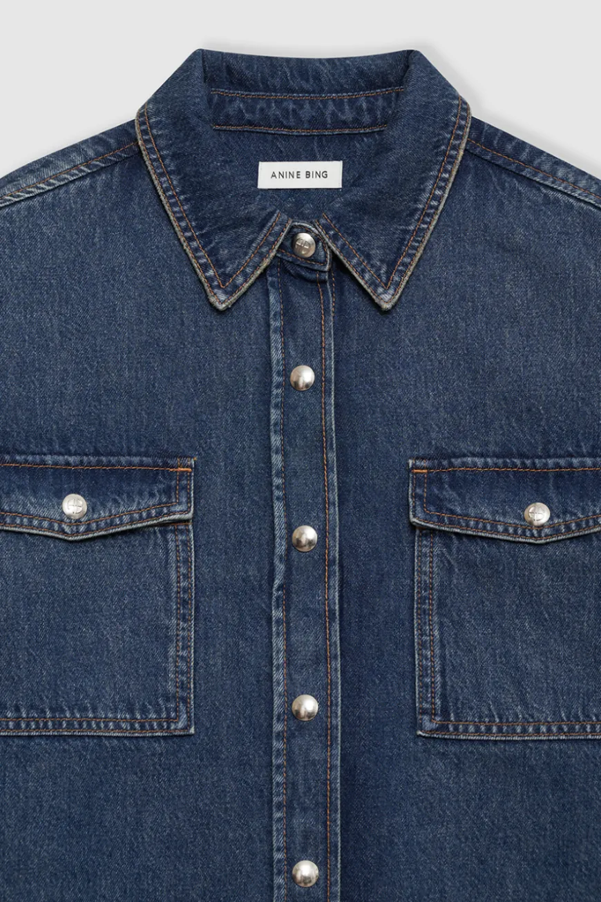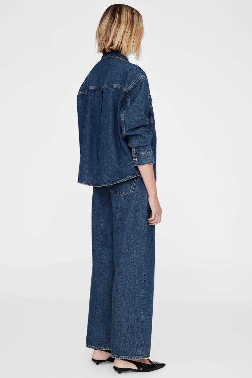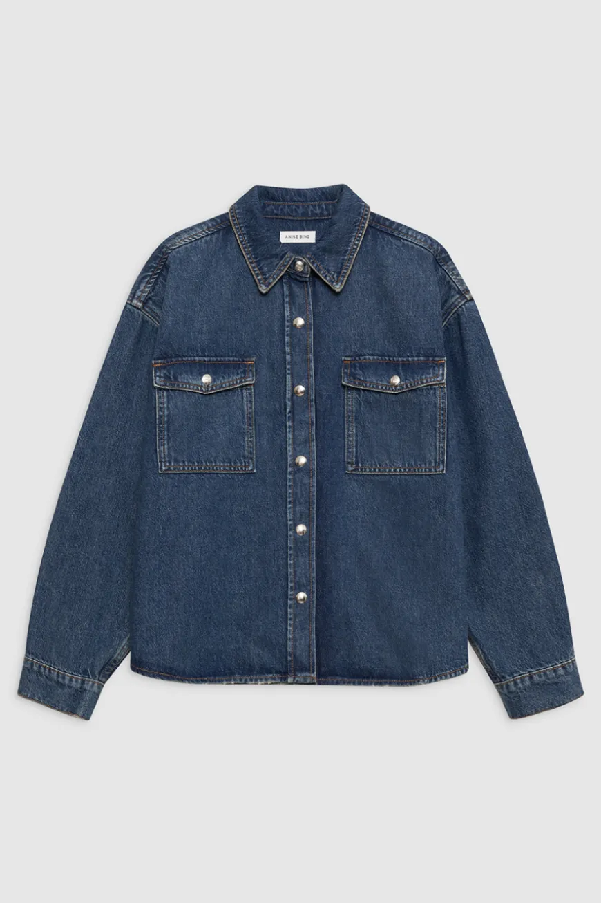 Classic denim shirt jacket by Anine Bing. Two front pockets on chest, buttons down the front, and standard collar. Styled here with the Manon Jean.