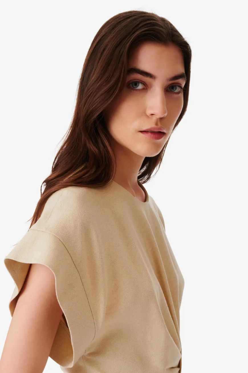 Wrap around dress effect in grained crepe, draping details, back zipper fastening.