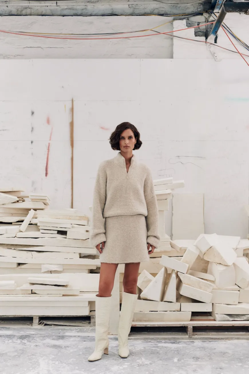 The Penn Mini Skirt is a sculptural, modern knit mini skirt. Crafted from a blend of premium wool and alpaca yarns it has a warm and soft hand feel. Its silhouette is elegantly A-line, complemented by a flawlessly finished cast-off hem and a snug tubular waistband with encased elastic. Elevate your look by pairing it with the Boyd Boucle Half Zip, effortlessly merging contemporary style with cozy comfort.