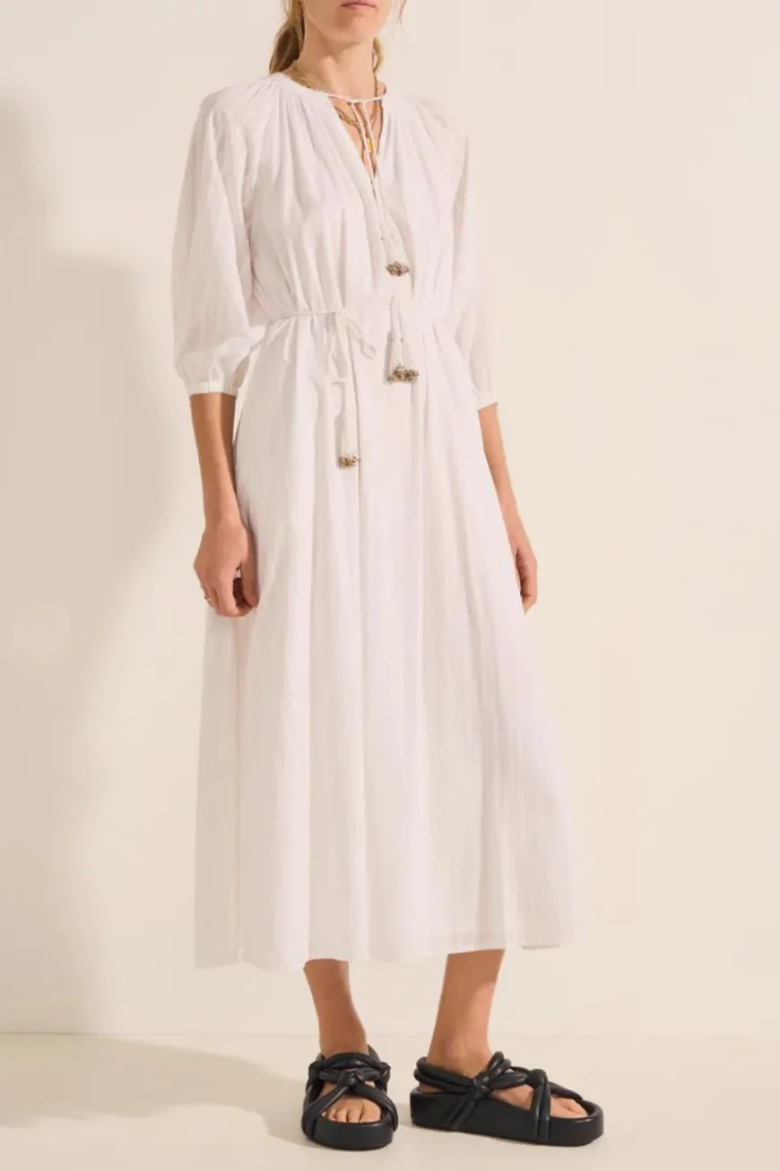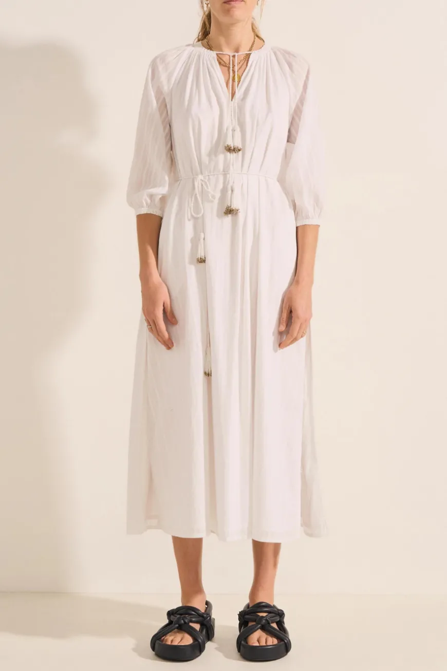 The Priam Caftan is an effortless style crafted in white striped cotton voile. This breezy summer caftan is maxi length and features 3/4 sleeves with elastic cuffs, a deep neckline, high slits and side pockets. This unique and striking caftan is completed with hand crochet neck and cuff detail and hand-beaded tassels. It’s a must have! It comes with a separate rope tassel belt and is fully lined.