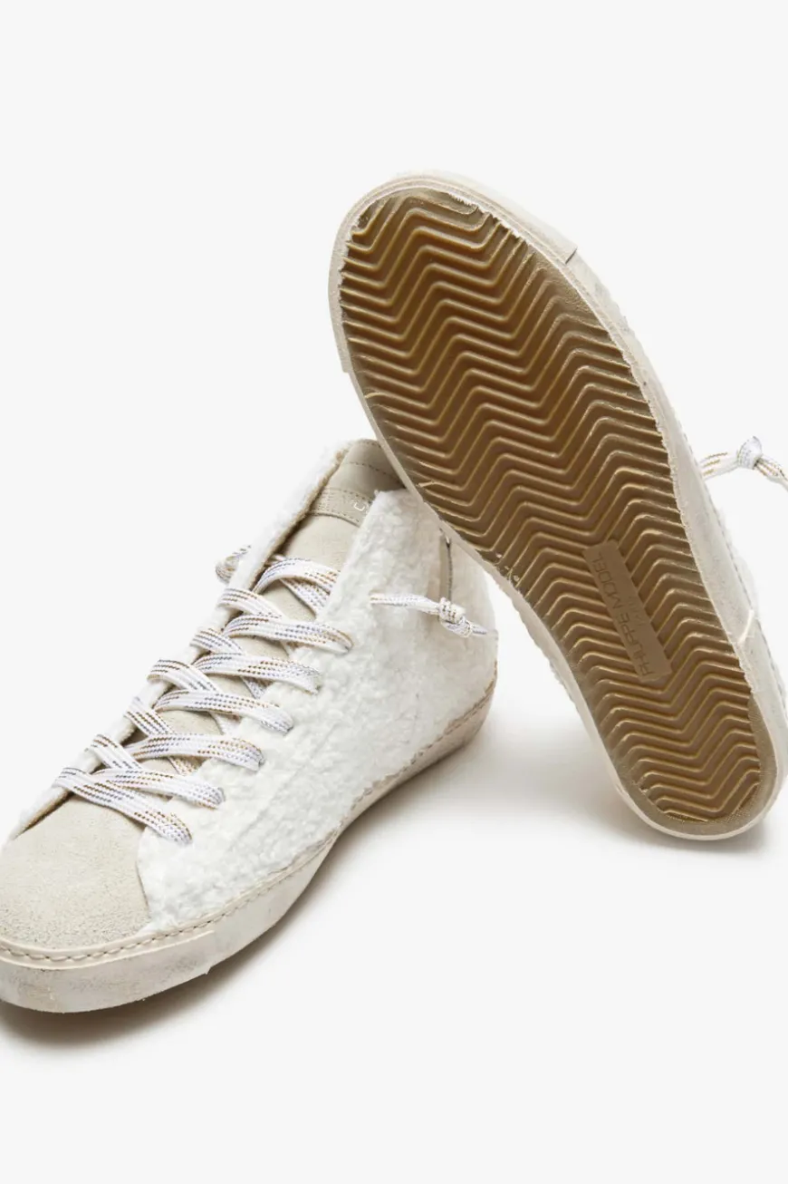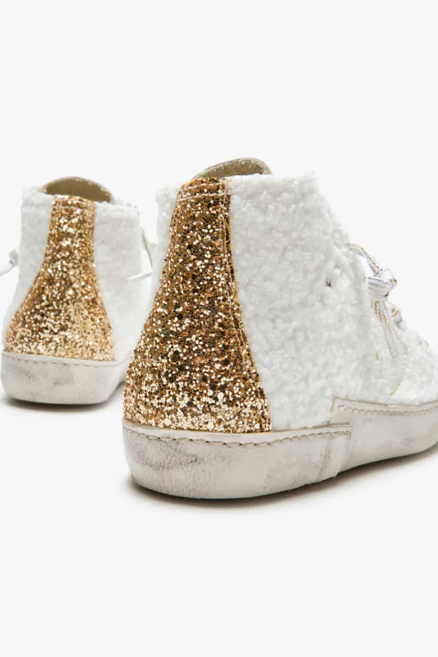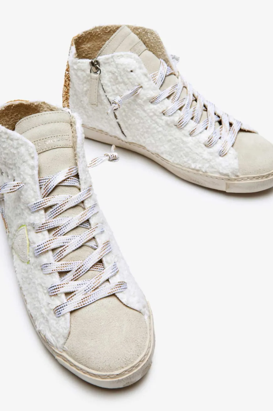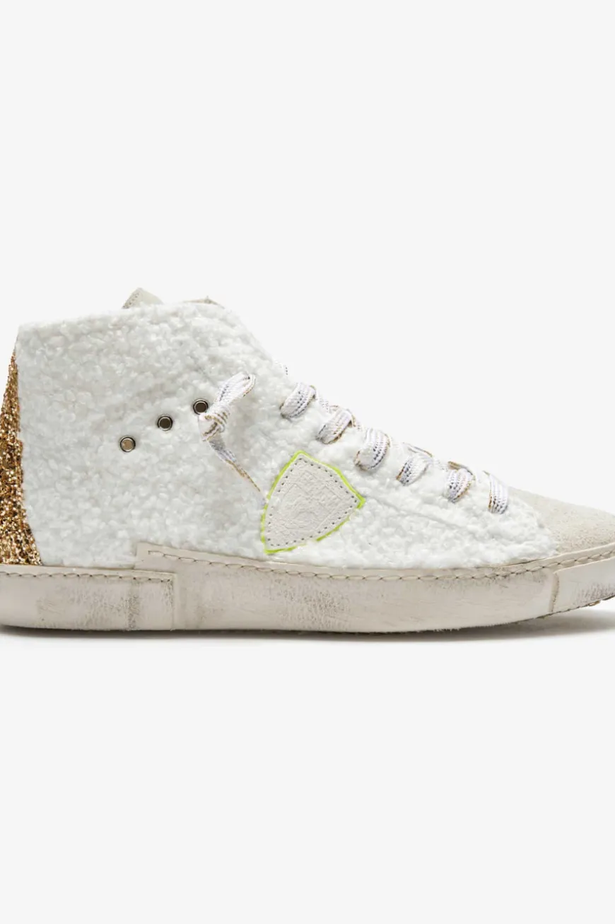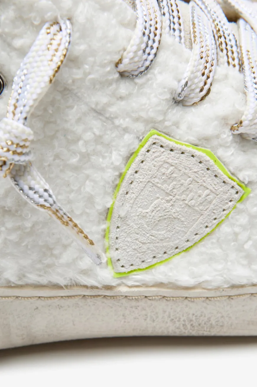 Prsx Bear high-top sneakers for women from Philippe Model in cream, gold and neon yellow. yellow. The model impresses with a fluffy teddy fur look in a tonal color scheme. The sporty yet fashionable look is rounded off with glitter details. details in a glitter look.
