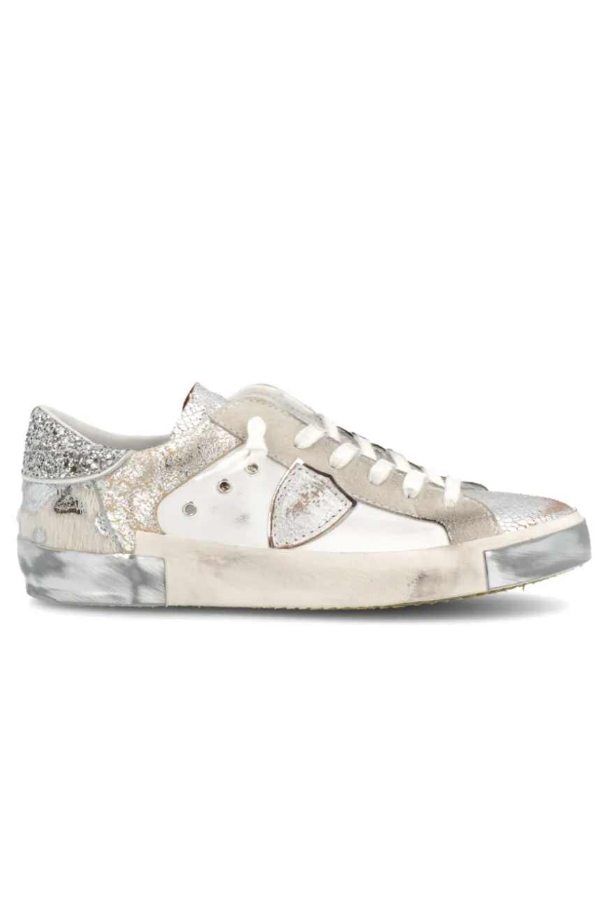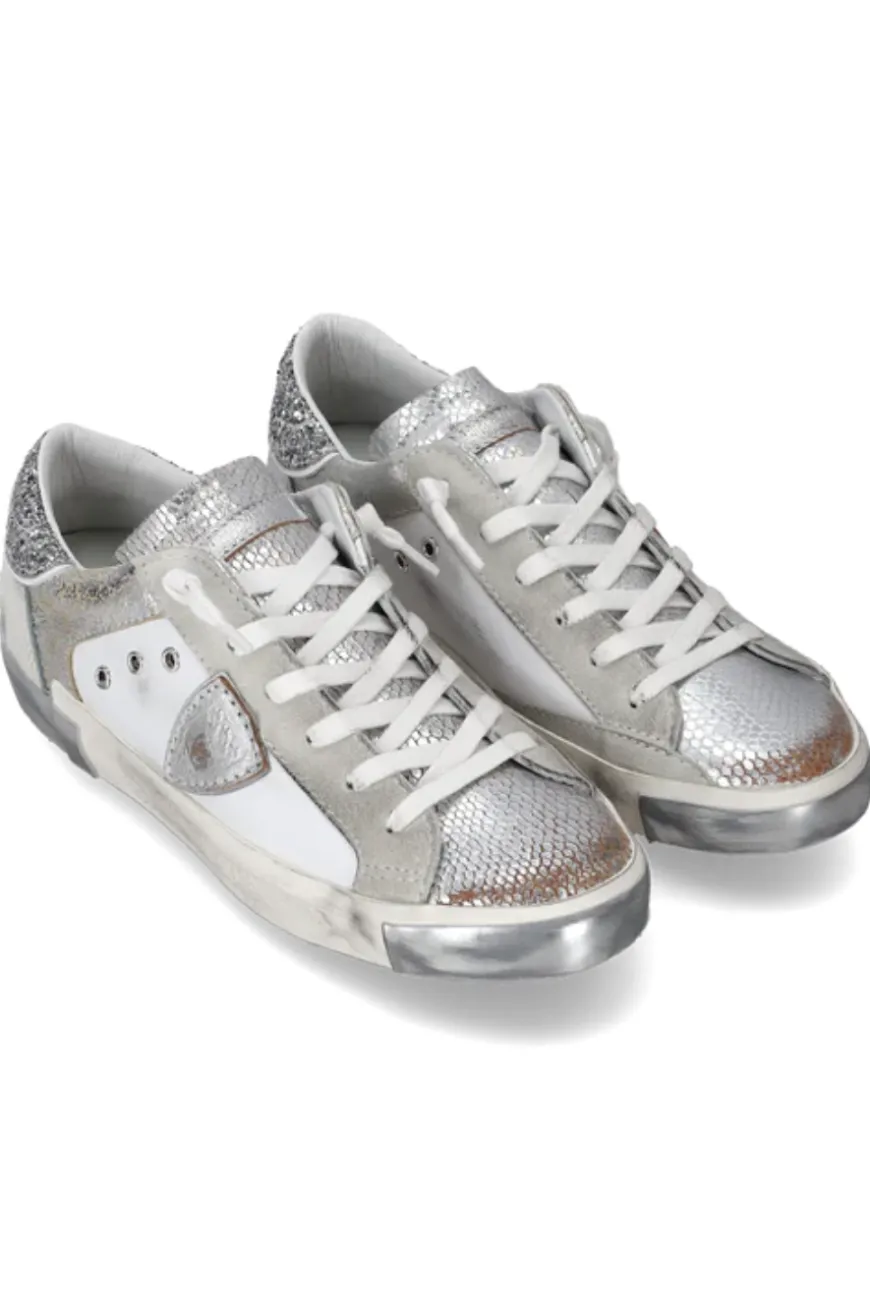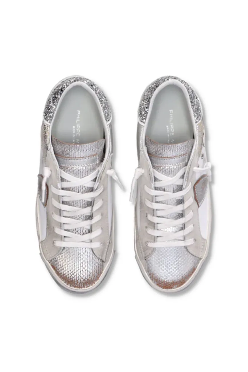 Sparkling silver, the new silver version of the Prsx sneaker, with an upper made from silver laminated materials, and leopard-print and metallic reptile-print details. The result is a decidedly fashionable look, based on the iconic designs of ‘80s skater shoes. The handcrafted side band is complemented by markings and silver details on the toe and heel.