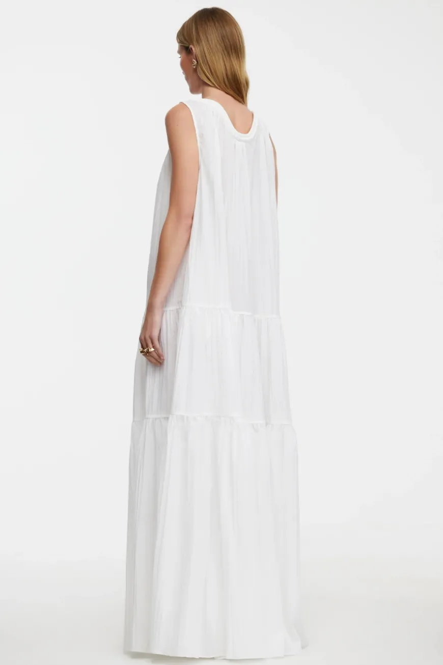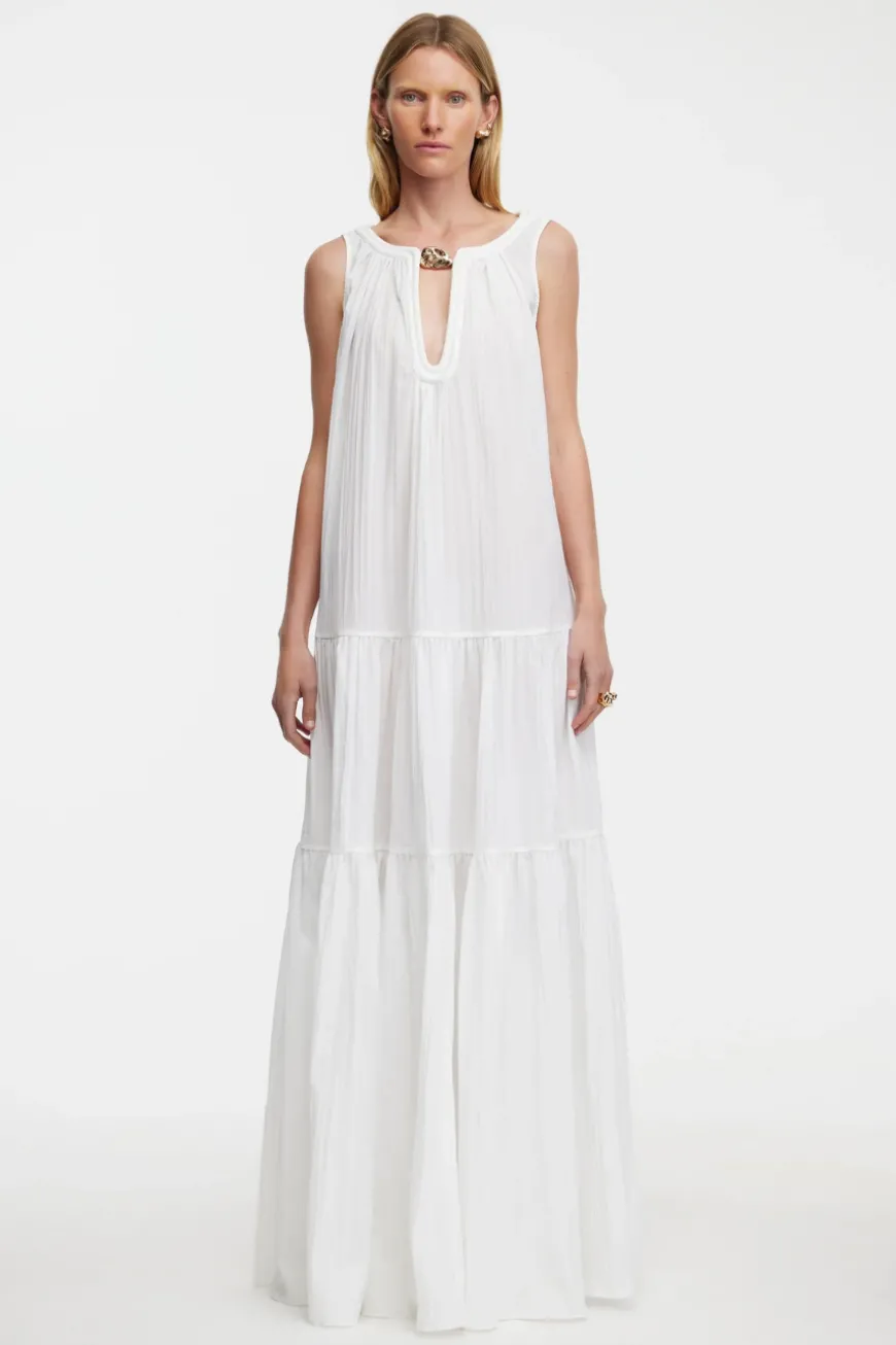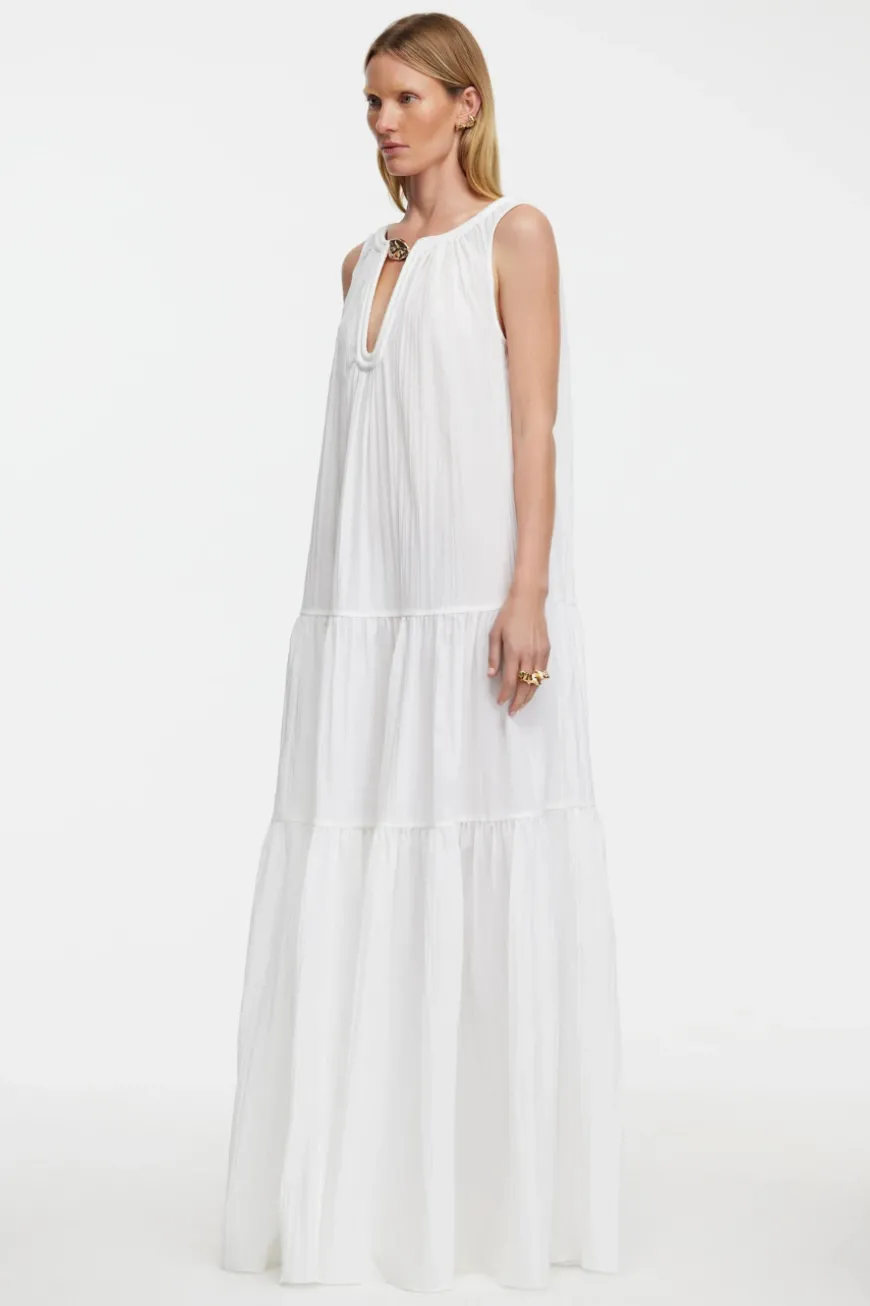 Introducing the Radmoor Maxi Dress in Ivory, a beautifully tiered and gathered maxi dress crafted from crinkle fabric for a relaxed, effortless fit. This flowing design features a deep front neckline accented by gold hardware for a touch of sophistication. Hidden side seam pockets add a practical element, while the unlined construction gives it a lightweight, breezy feel—perfect for casual elegance.