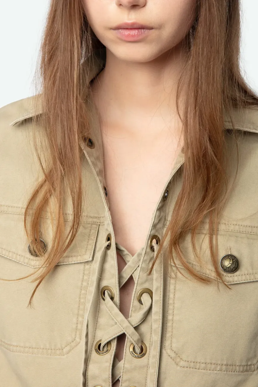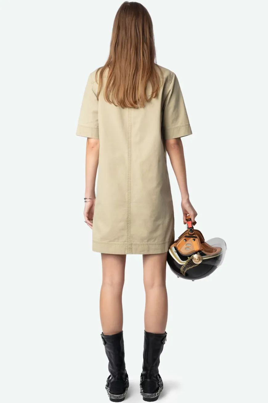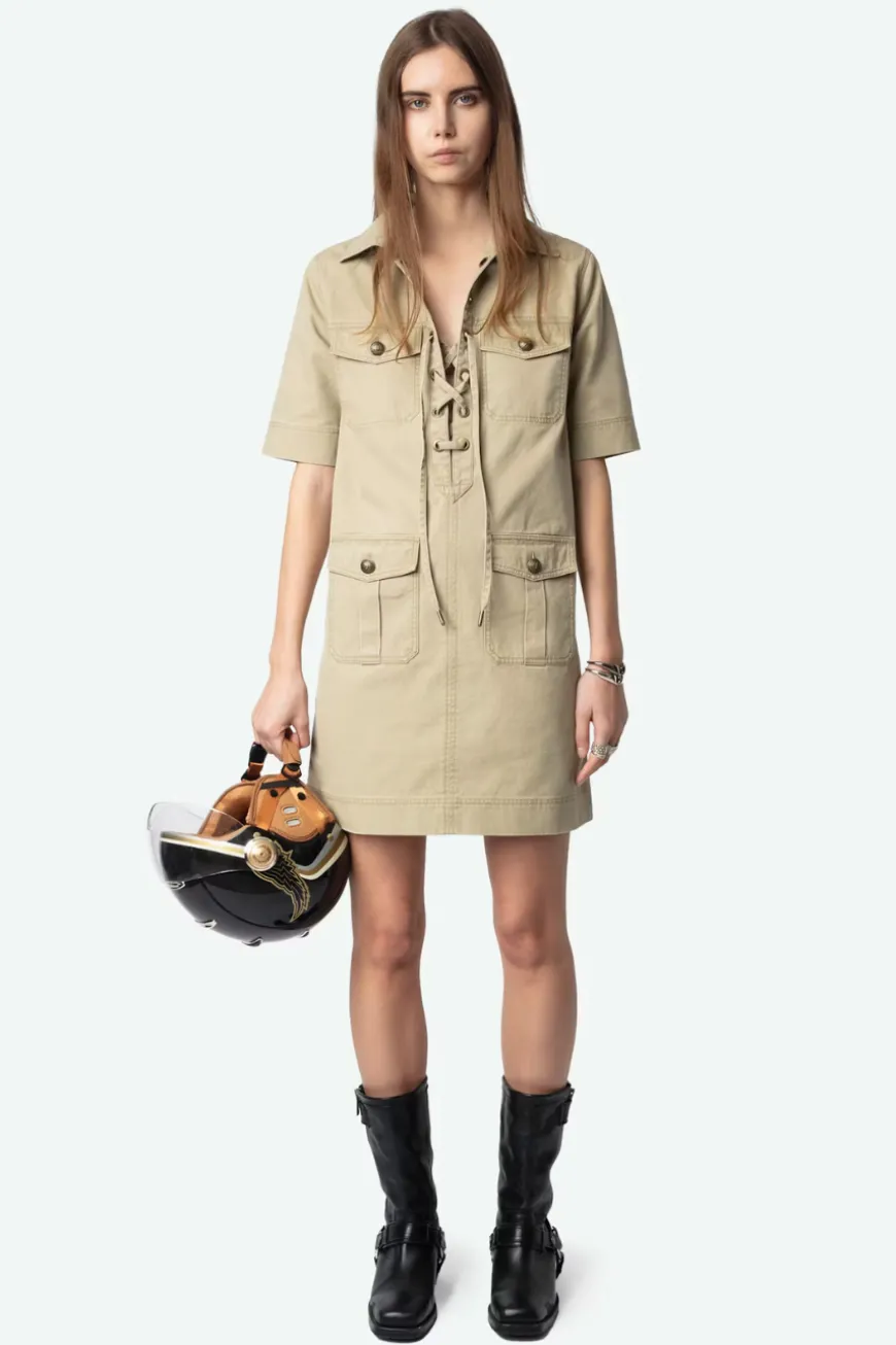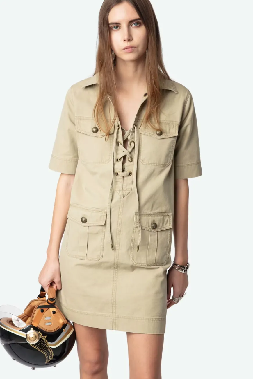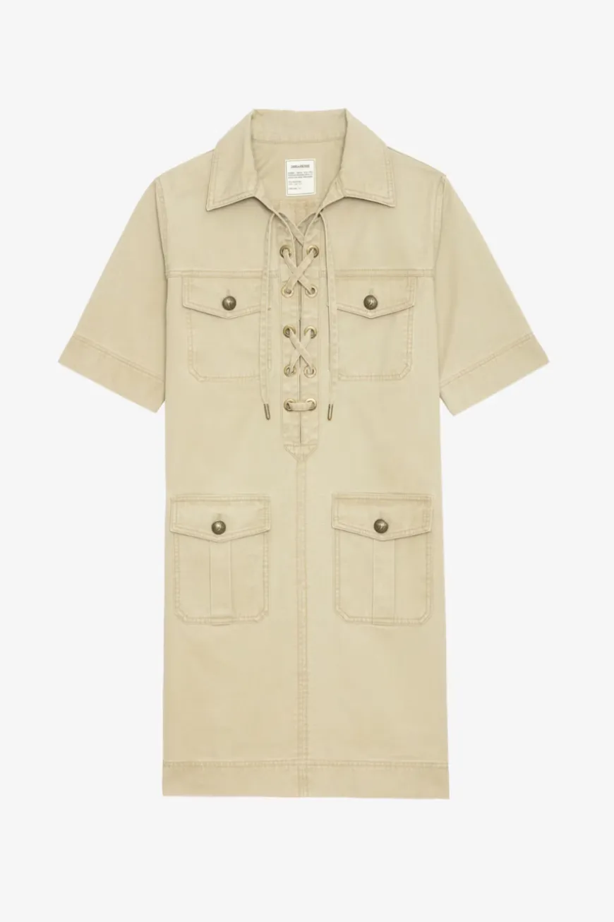 Short military-inspired dress in washed cotton, short sleeves, laced neckline, and multiple pockets.