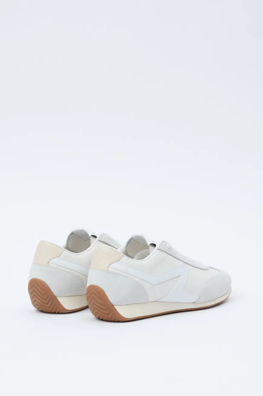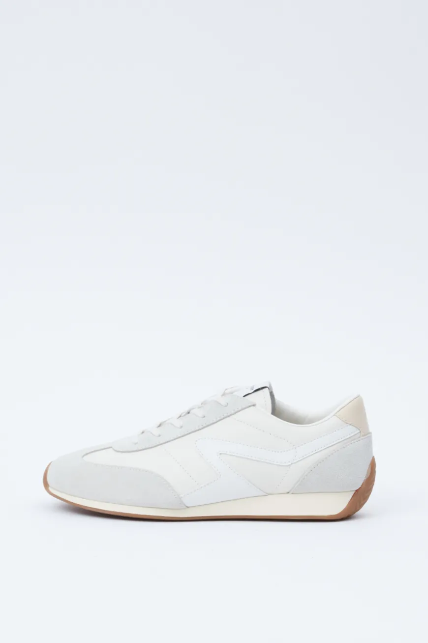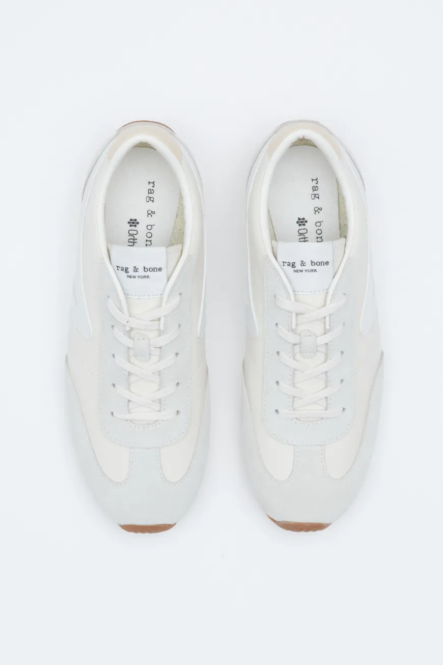 The Retro Runner. A slimmer take on an old-school trainer. This retro-inspired almond toe sneaker is made from a varsity-inspired satin nylon and soft Nappa suede. Crafted with dual-density antimicrobial foam insoles: OrthoLite Lazy-Hybrid for custom-fit comfort, and OrthoLite Recycled for stability and support.
