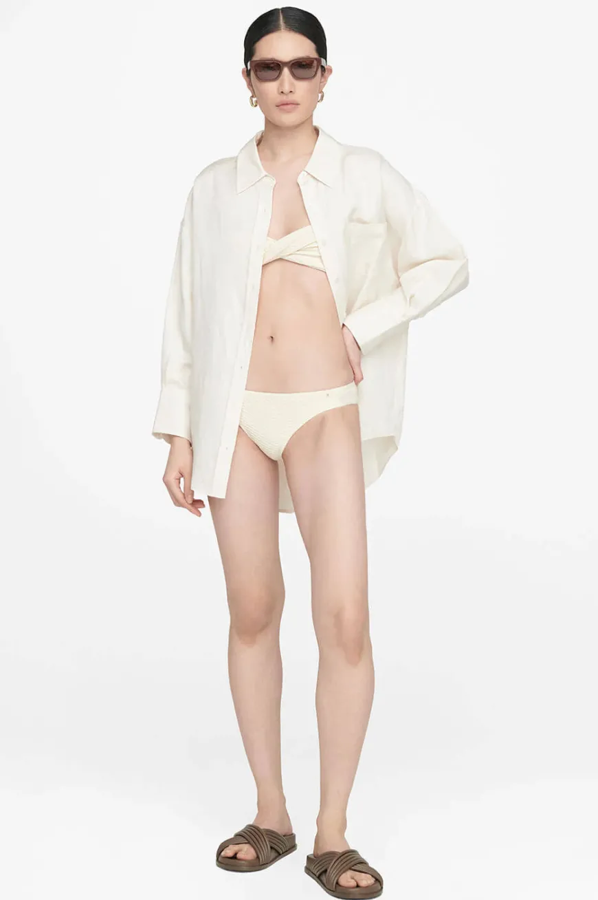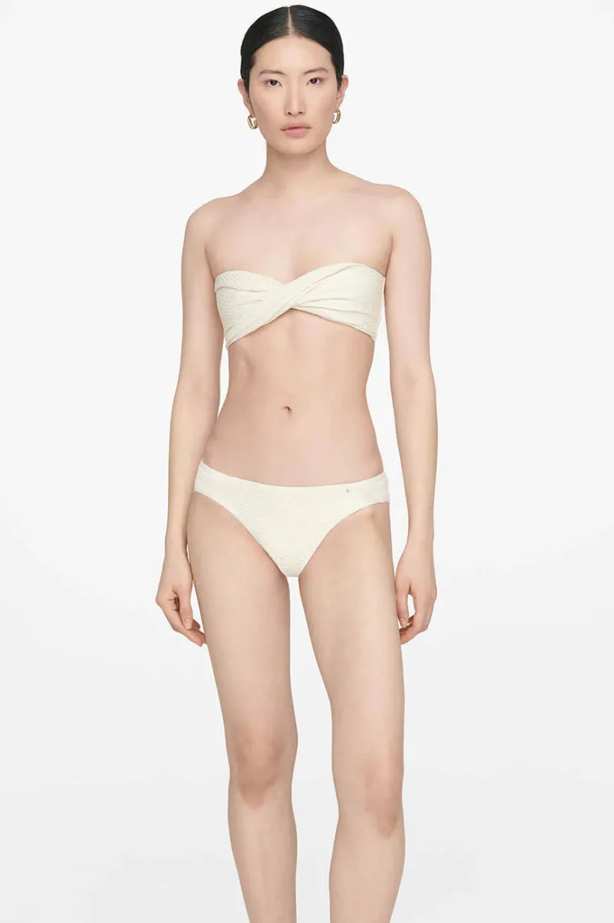 The Riza Bikini Bottom is cut for a close fit with a low waistline and modest coverage. Take your true size.