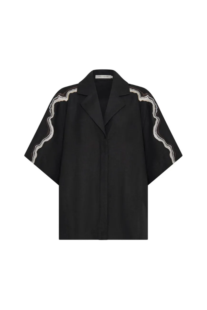 The Serene Shirt combines a relaxed fit with artistic flair, featuring embroidered artwork that adds a unique touch. Crafted from a woven linen blend, it ensures both comfort and breathability, perfect for warm-weather wear. The side splits enhance ease of movement, making this shirt a versatile addition to any casual wardrobe.