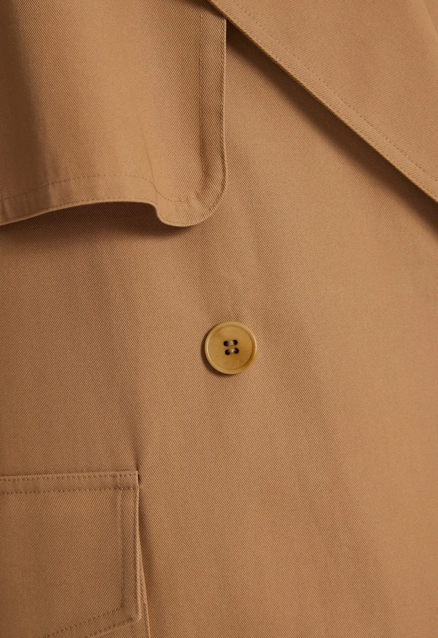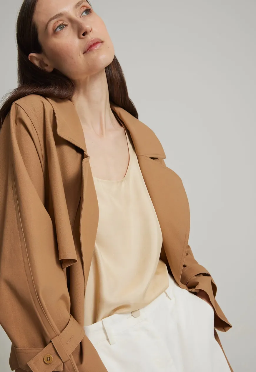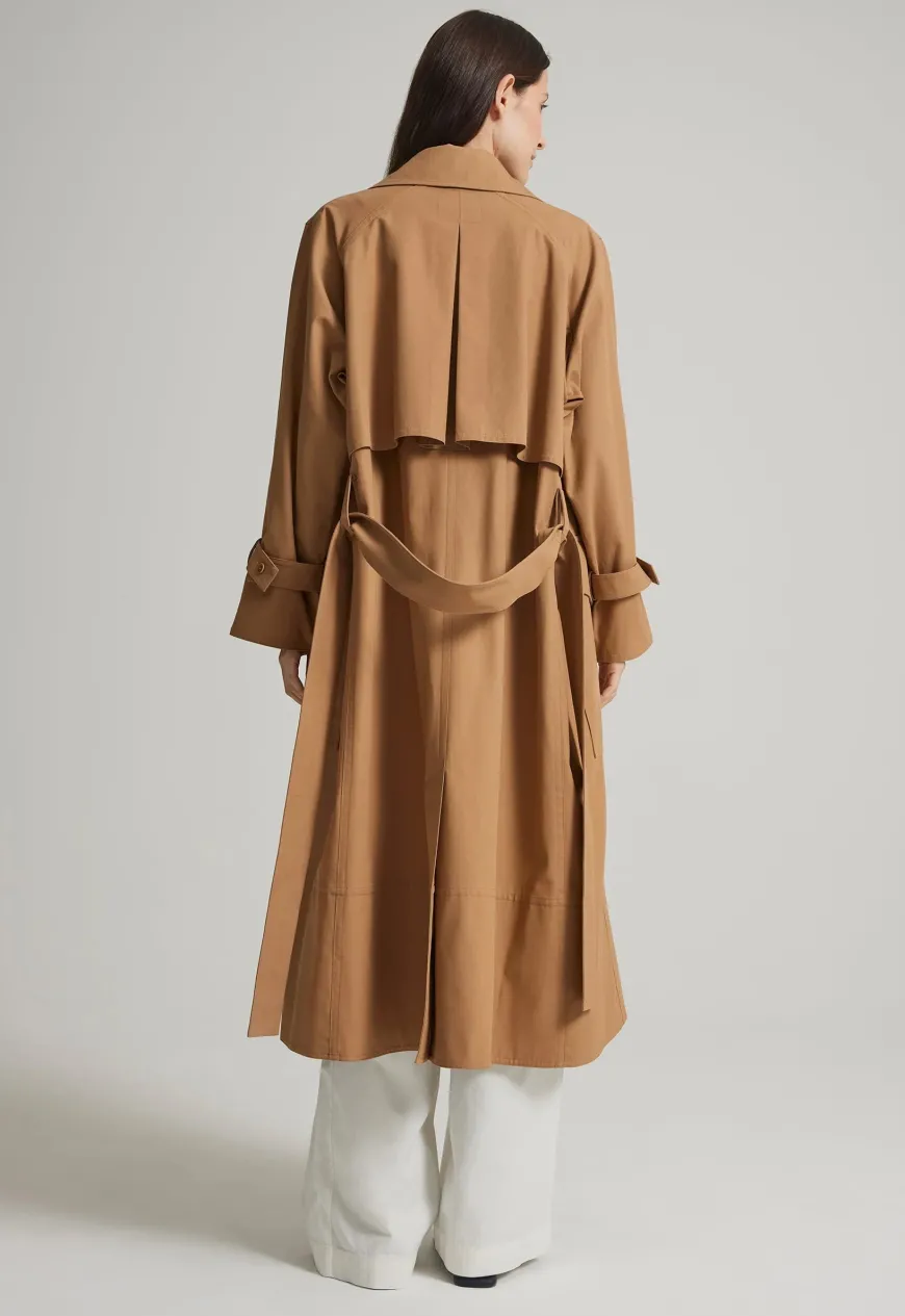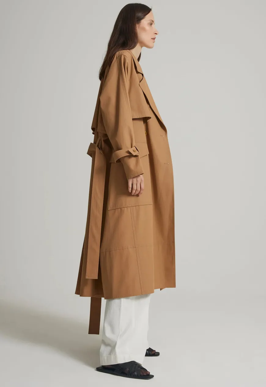 A stylish yet practical outerwear piece perfect for any season. This trench is made from a Japanese organic cotton twill. A modern approach to a classic trench silhouette the cut is oversized and long line with a self tie belt to cinch at the waist. Features include large pockets for holding essentials and pared back detailing for a timeless look.